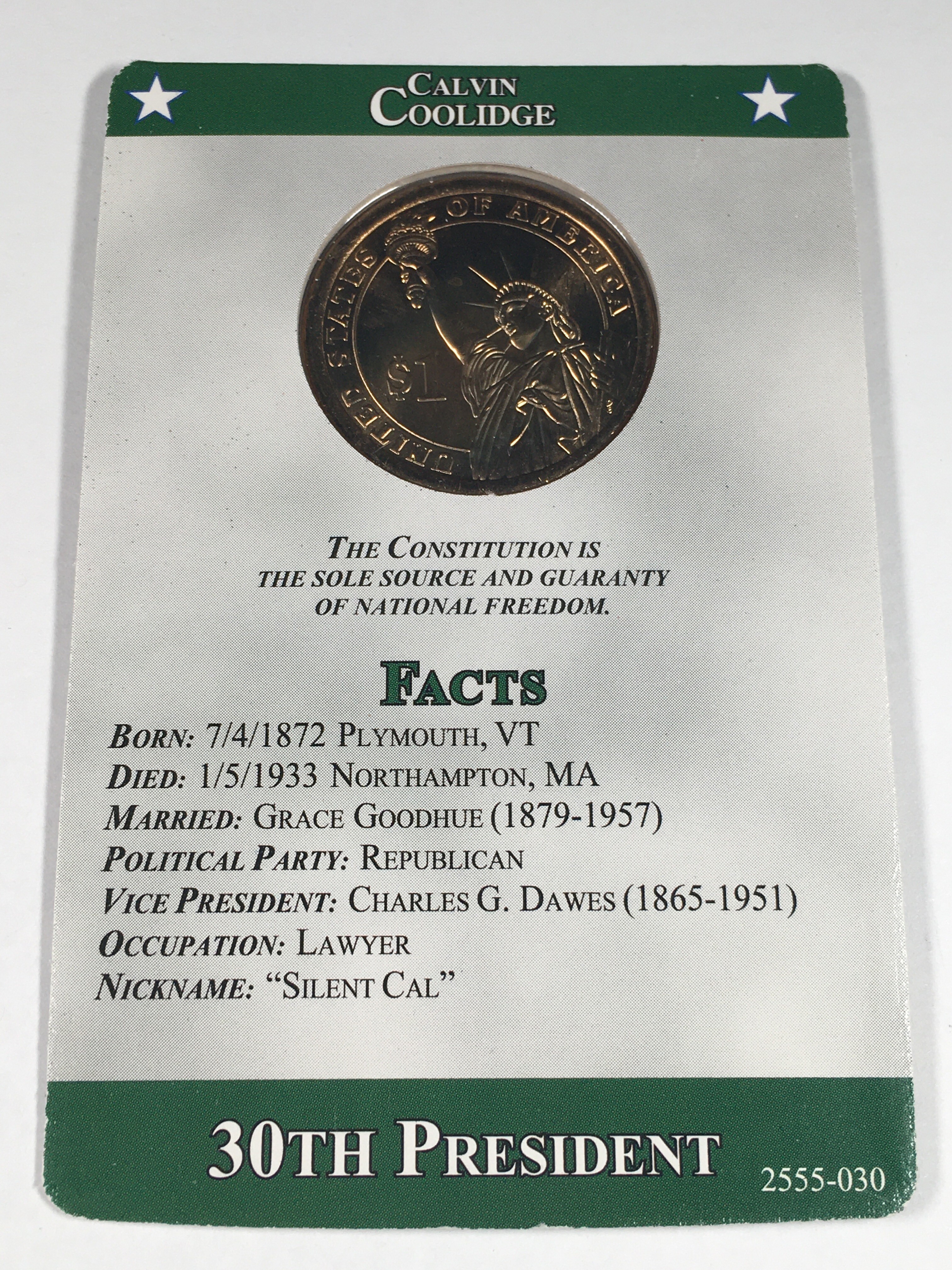 Calvin Coolidge Presidential Commemorative Dollar*Brilliant Uncirculated*Facts Card