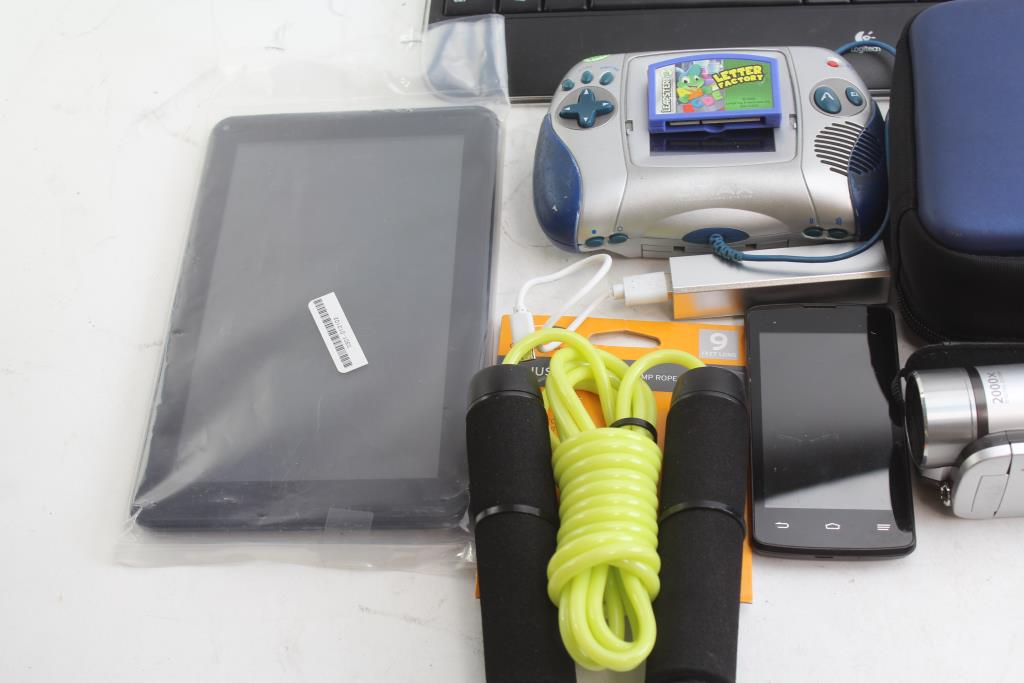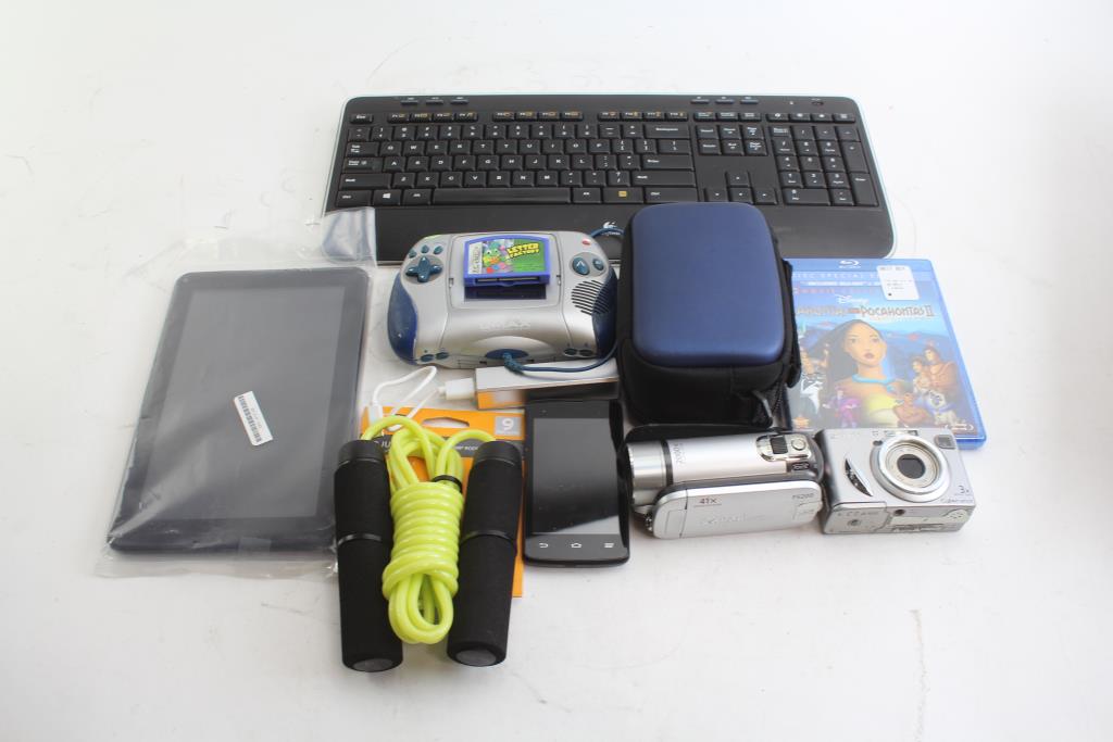 Get a great deal with this online auction for a goody box presented by Property Room on behalf of a law enforcement or public agency client. - Canon Camcorder, Logitech Keyboard, Pocahontas Blu-Ray, Leapster Max, and More
