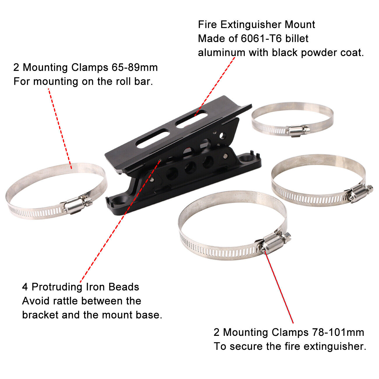 2 mounting clamps to secure the fire extinguisher and 2 for mounting on the roll bar