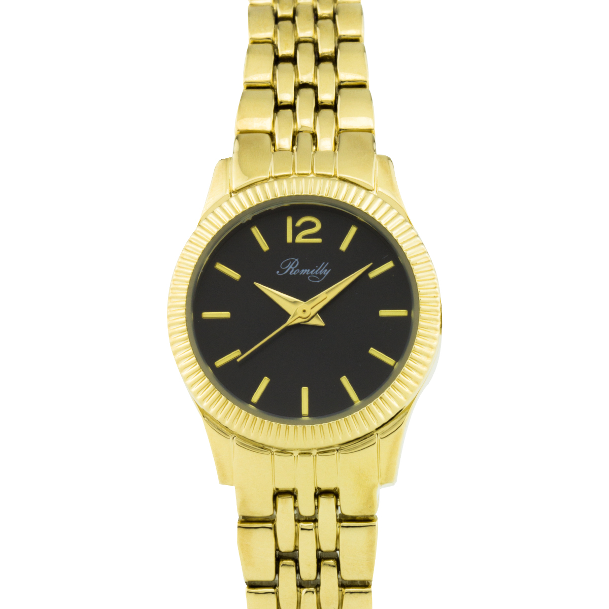 • From the fluted bezel to the elegant sunray finished dial, this watch speaks immediately to a world of luxury that few can afford. Luckily, Romilly makes this dream a reality with down to Earth pricing, and reliable quality. Once you wrap the multi.link bracelet around your wrist, you won't want to take it off. Hands: Luminescent Caseback Type: Screw.down Strap Color: Gold.Tone Type: Analog, Casual Caseback Material: Stainless Steel Product Features: Three Hand, Water Resistant Material: Stainless Steel, Metal Case Shape: Round Case Thickness: 7mm Strap Width: 11mm Strap Movement: Japanese Quartz Strap Length: Adjustable Dial Color: Black Case Diameter: 23mm Crown: Push.pull Gender: Female Closure Type: Fold over Clasp Water Resistance Depth: 30 Meters Dial Window Material: Mineral