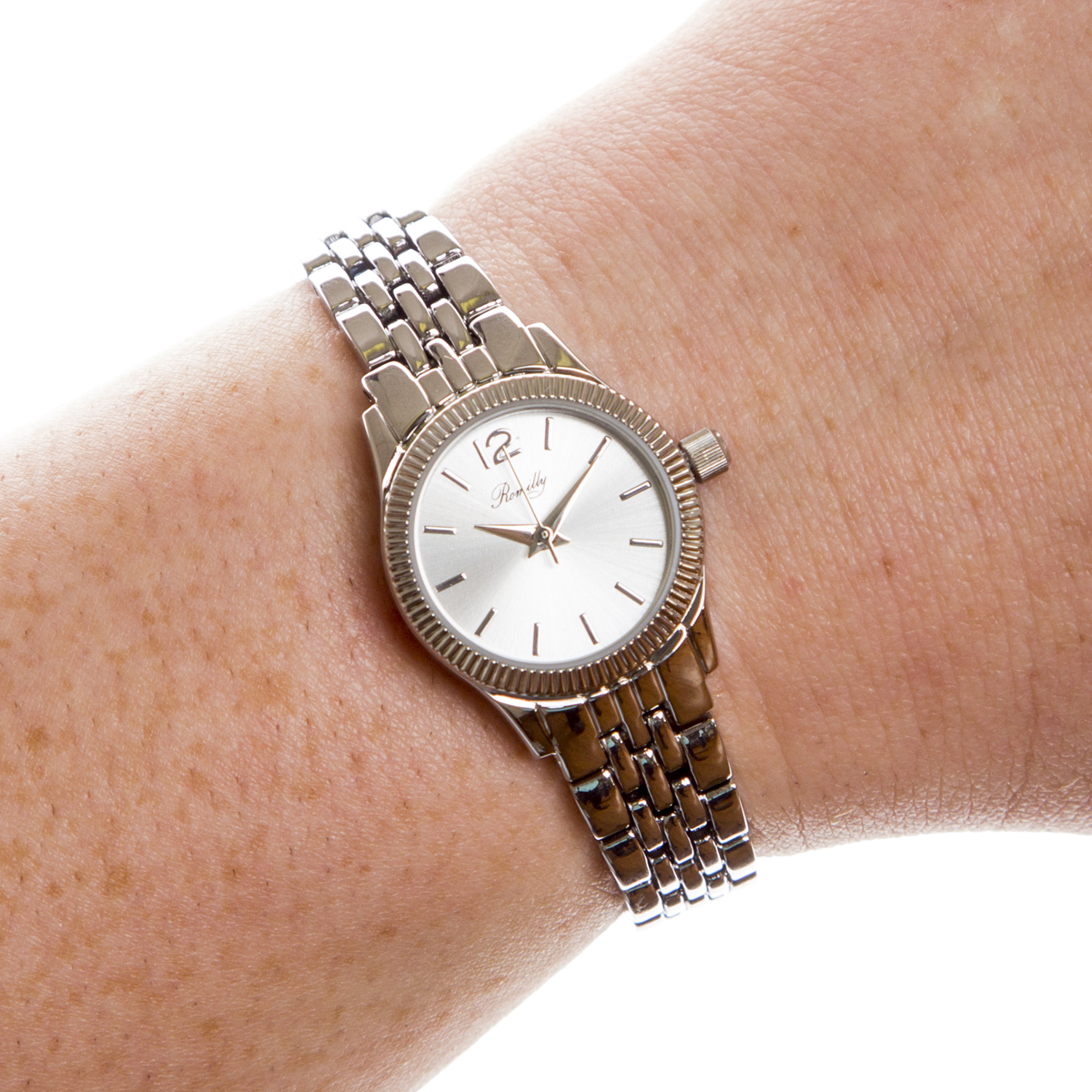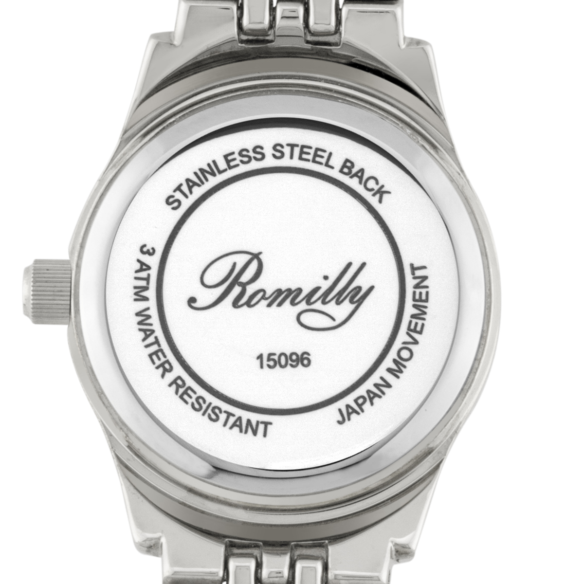 • From the fluted bezel to the elegant sunray finished dial, the Romily speaks immediately to a world of luxury that few can afford. Luckily, Romilly makes this dream a reality with down to Earth pricing, and reliable quality. Once you wrap the multi.link bracelet around your wrist, you won't want to take it off. Hands: Luminescent Caseback Type: Screw.down Strap Color: Silver.Tone Type: Analog, Casual Caseback Material: Stainless Steel Product Features: Three Hand, Water Resistant Material: Stainless Steel, Metal Case Shape: Round Case Thickness: 7mm Strap Width: 11mm Strap Movement: Japanese Quartz Strap Length: Adjustable Dial Color: silver.tone Case Diameter: 23mm Crown: Push.pull Gender: Female Closure Type: Fold over Clasp Water Resistance Depth: 30 Meters Dial Window Material: Mineral