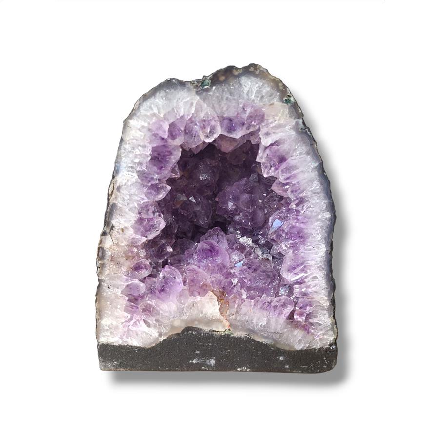 Product Description: Introducing the splendor of nature crystallized over millennia: our Cathedral Cut Amethyst, sculpted with a distinctive base cut design. Amethyst, one of the most revered members of the quartz family, boasts a rich, violet hue that captures the essence of geologic beauty. It stands as a testament to the wonderous processes that have sculpted our Earth’s treasures. Each facet and structure of this piece speaks of the marvels of nature. The exact specimen captured in the photograph awaits to be a prized addition to your collection.