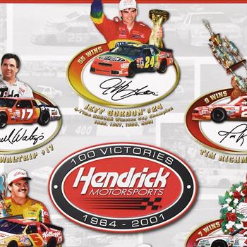 "Celebrating 100 Victories" is a limited edition collectible poster from an edition size of 10,100. This piece bears the plate signatures of such NASCAR greats Jeff Gordon, Rick Hendrick, Ricky Rudd and more. Includes Letter of Authenticity. Measures approx. 20" x 24".