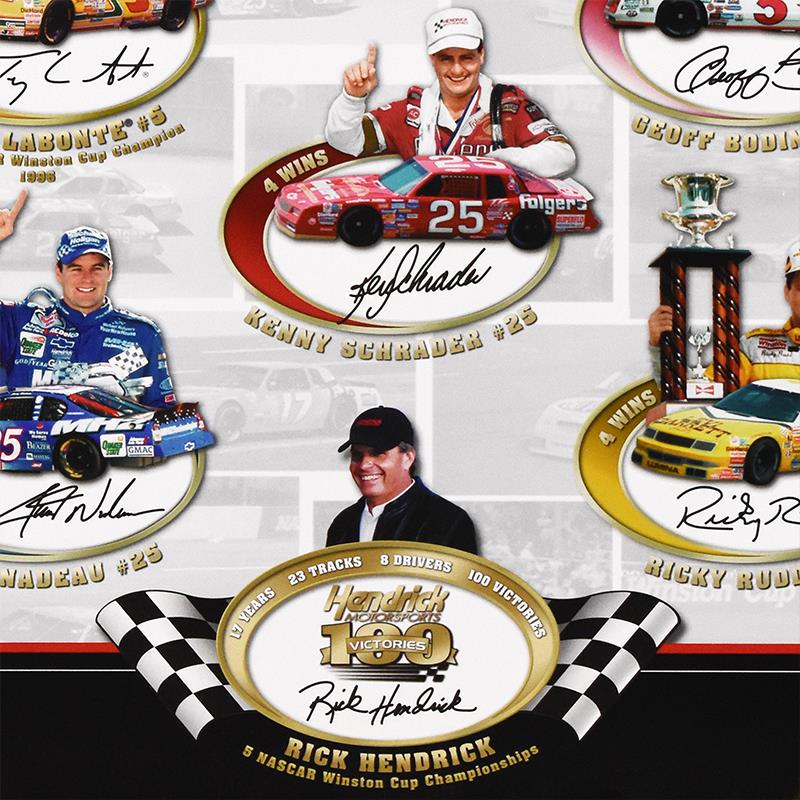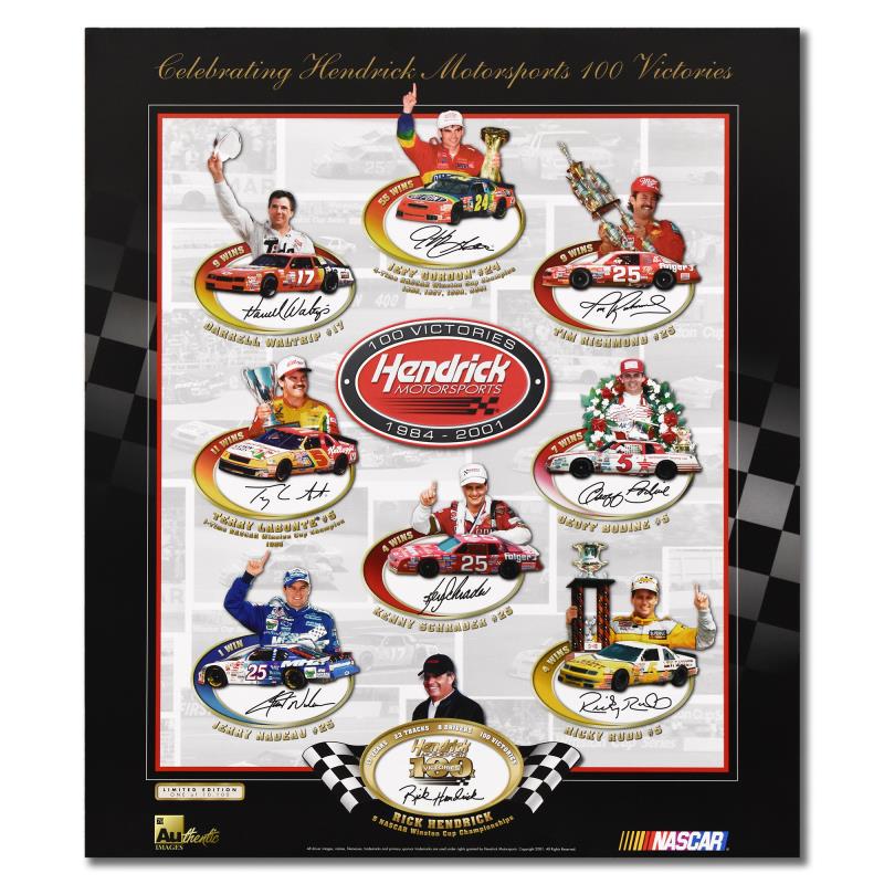 "Celebrating 100 Victories" is a limited edition collectible poster from an edition size of 10,100. This piece bears the plate signatures of such NASCAR greats Jeff Gordon, Rick Hendrick, Ricky Rudd and more. Includes Letter of Authenticity. Measures approx. 20" x 24".