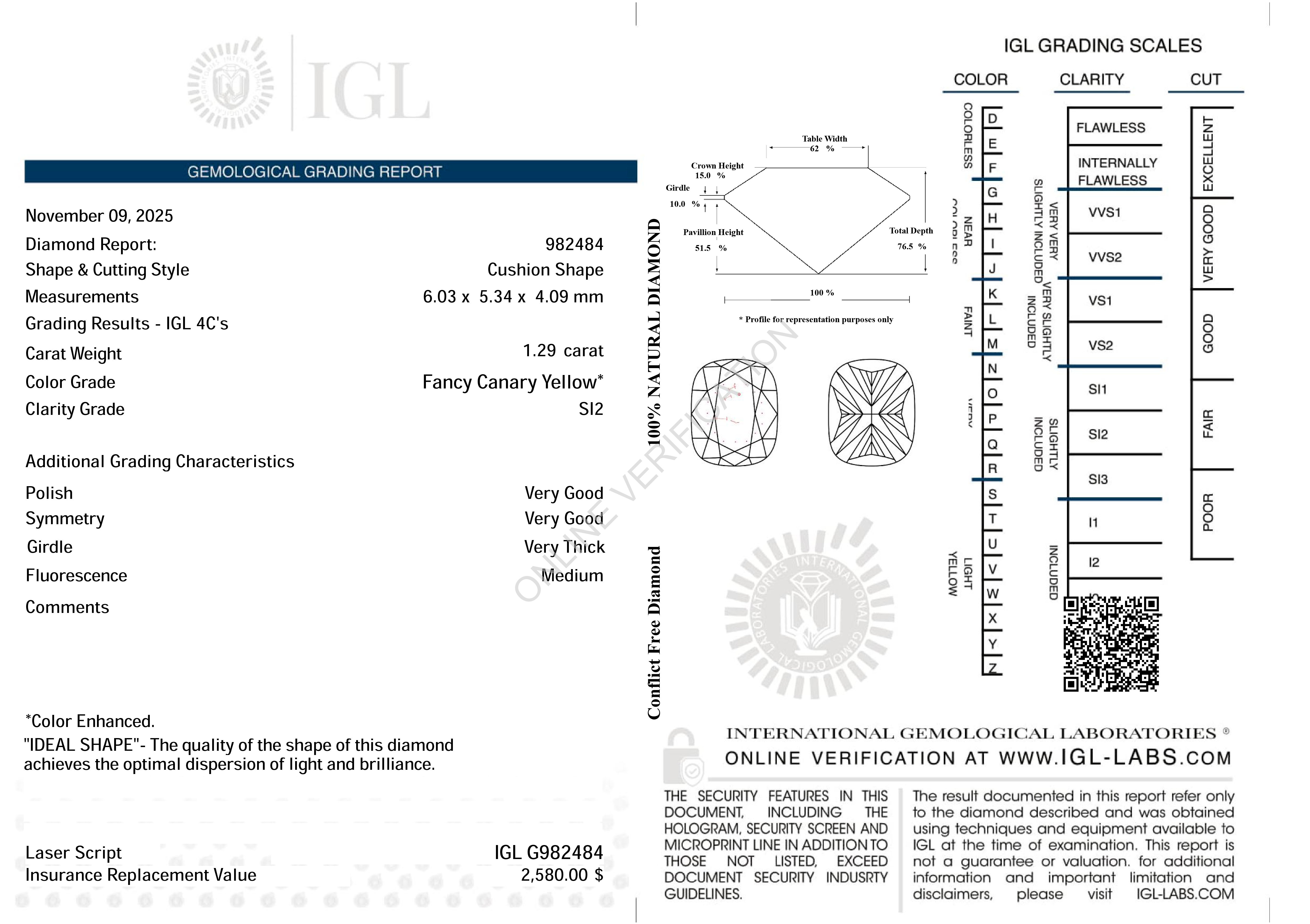 CERTIFIED 1.29 ct Natural Canary Yellow Diamond Cushion Cut Loose Gemstone |