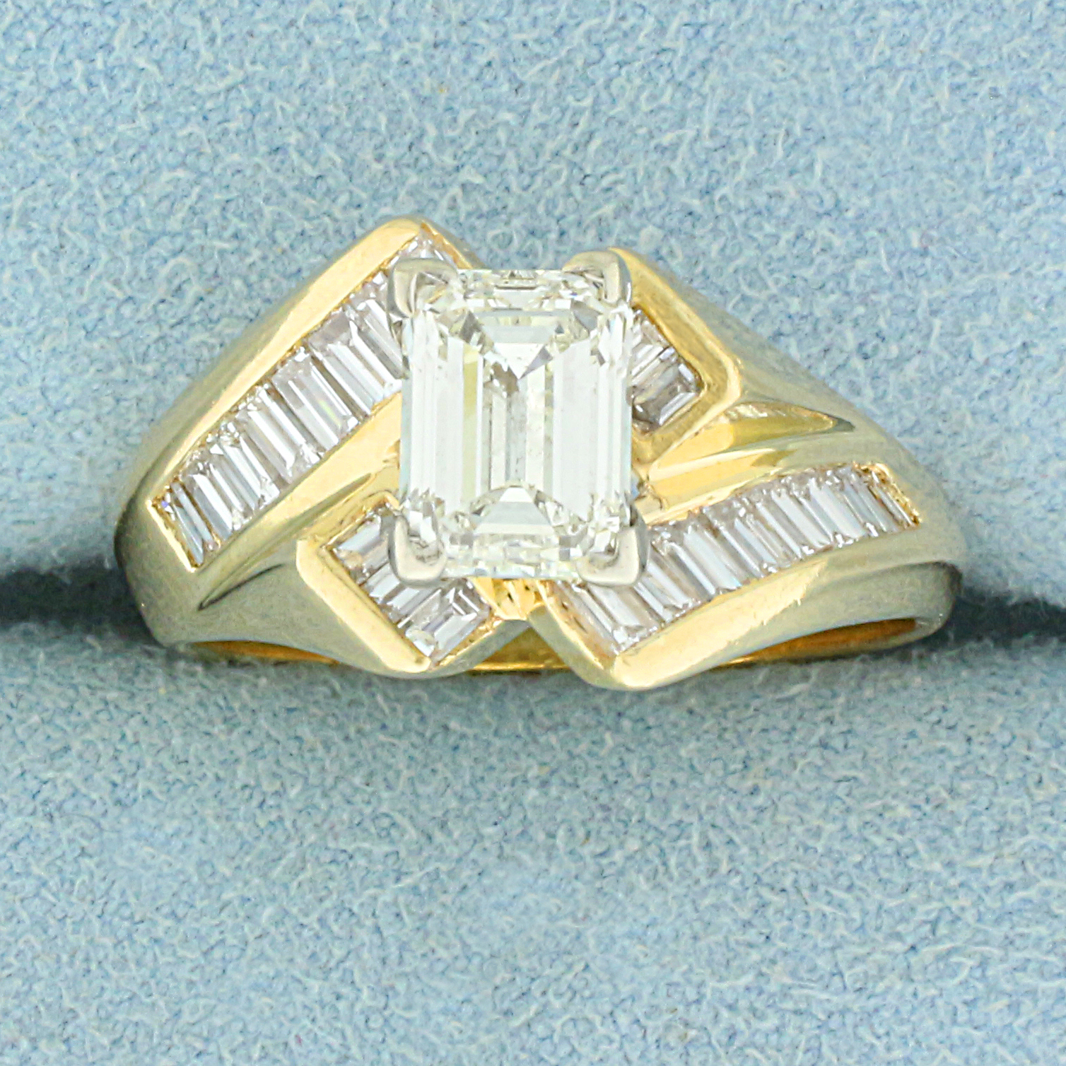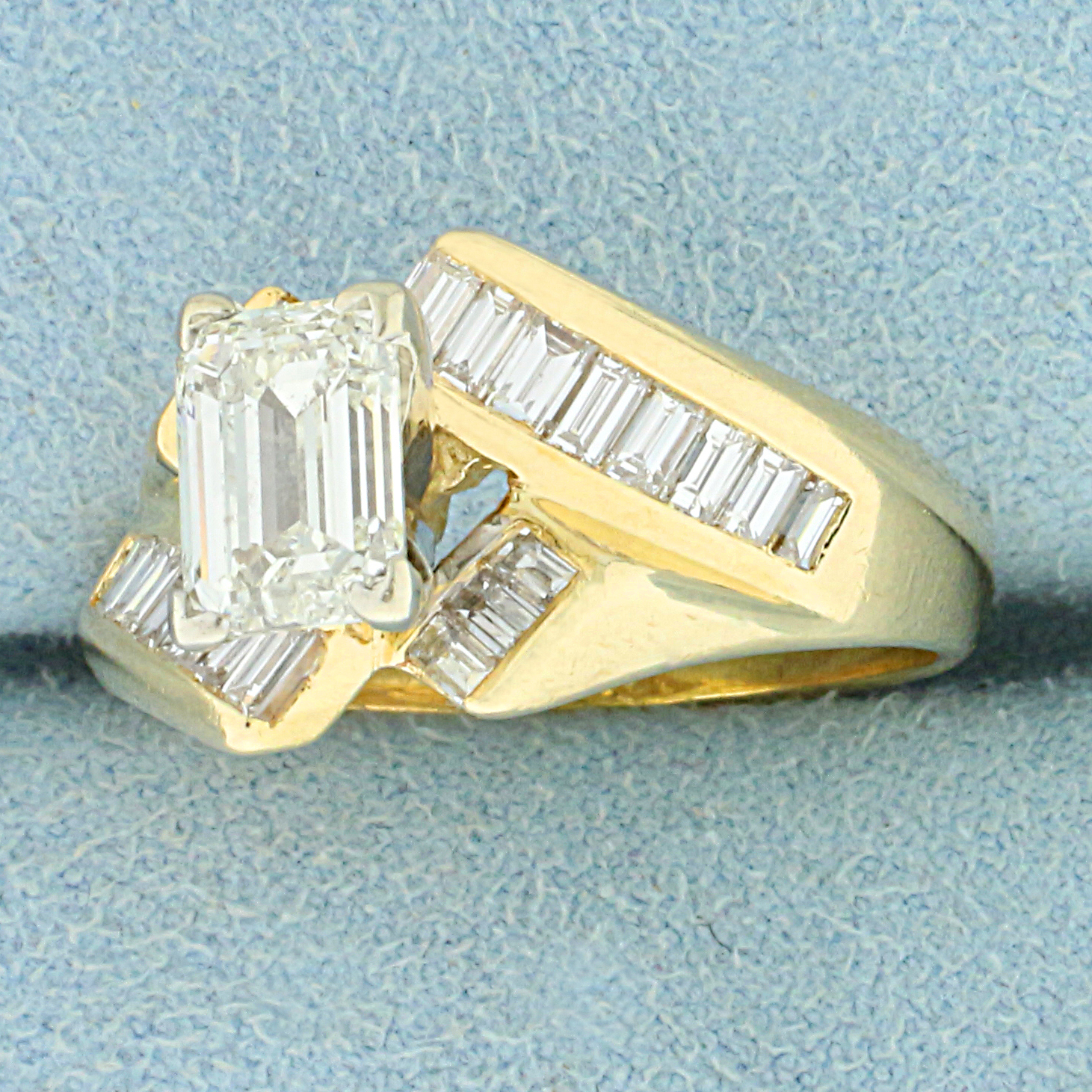 In 14K Yellow Gold. Contains one high quality EGL USA Certified 1.45ct Emerald Cut Diamond, VS1 Clarity/L color. Also contains twenty two high quality 2x1mm baguette cut Diamonds, .55ct TW, VS clarity/J color. 6.2g. Size 8.
