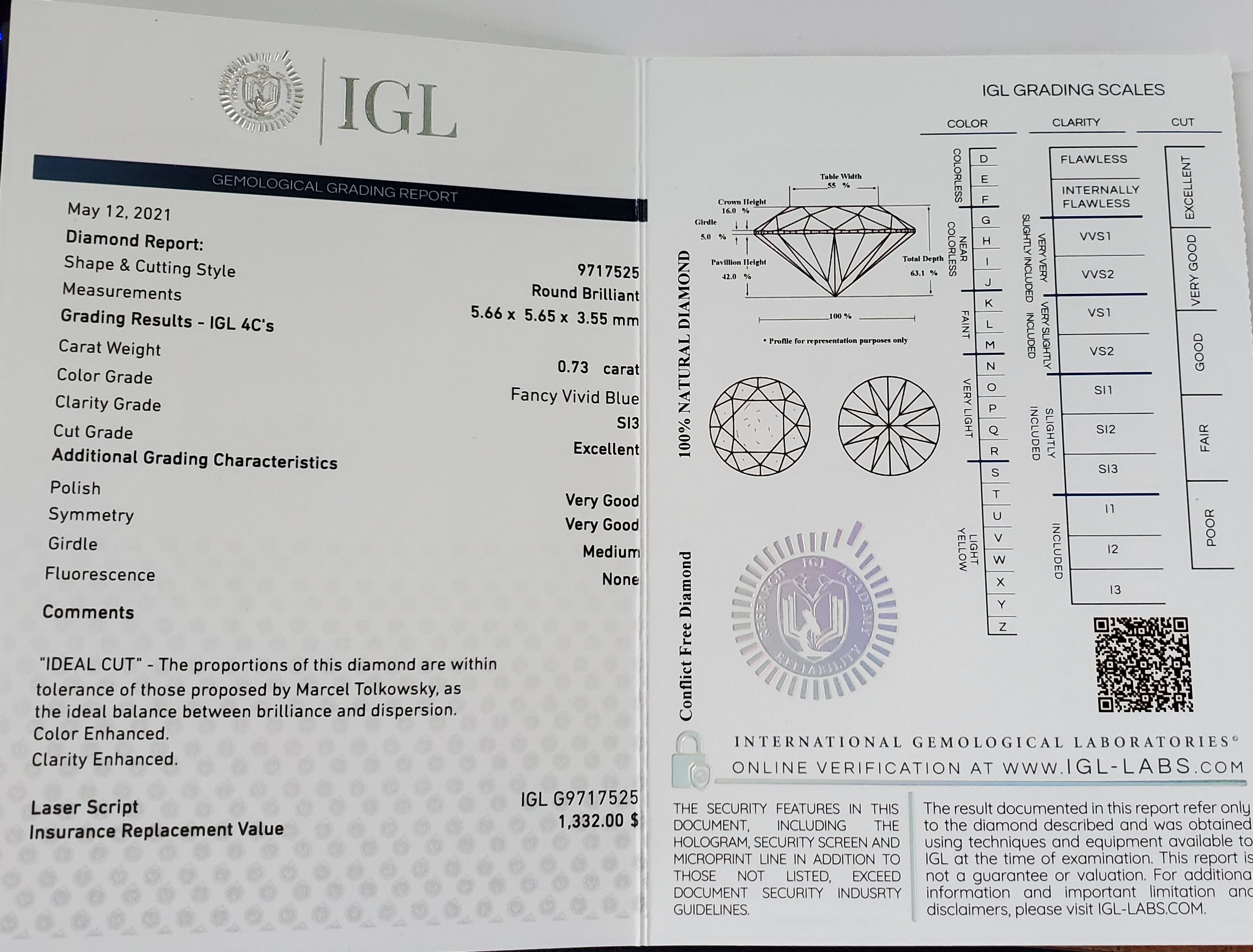 This diamond is laser inscribed. This diamond includes a lab certification report.