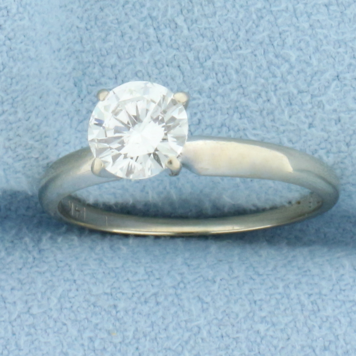 In 14K White Gold. Contains one high quality .63ct round brilliant Certified Diamond, G/H color, SI1 clarity. Note diamond is correct in certification but was mounted in a different setting than on certification. Size 4 1/2. 1.6g.