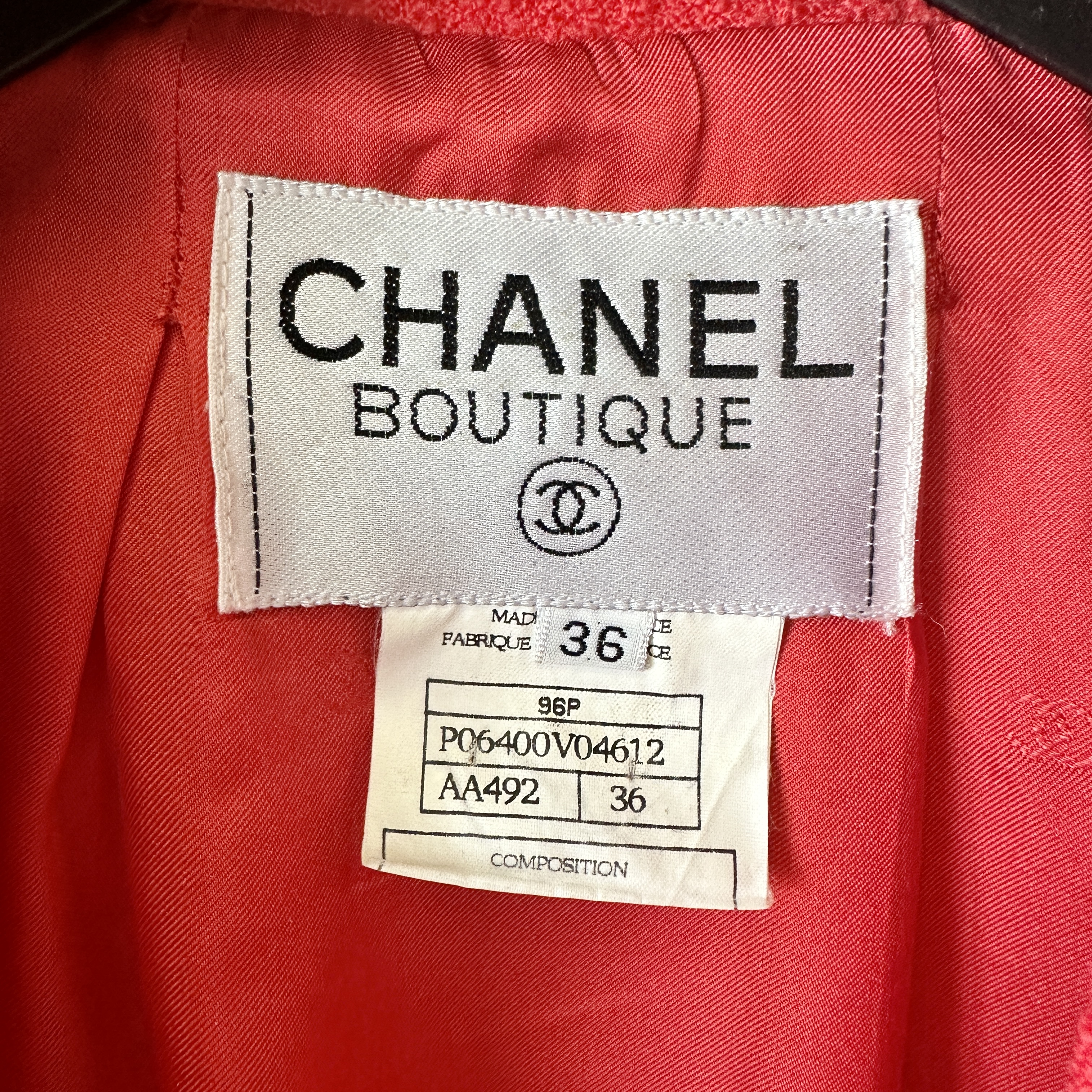 From 96P. P06400V04612, AA492, size 36. 100% wool with 100% CC logo design lining. Iconic CC silvertone logo tonal red buttons and chain hardware at bottom. Excellent vintage condition with minor imperfections. Freshly cleaned at couture specialty cleaners.