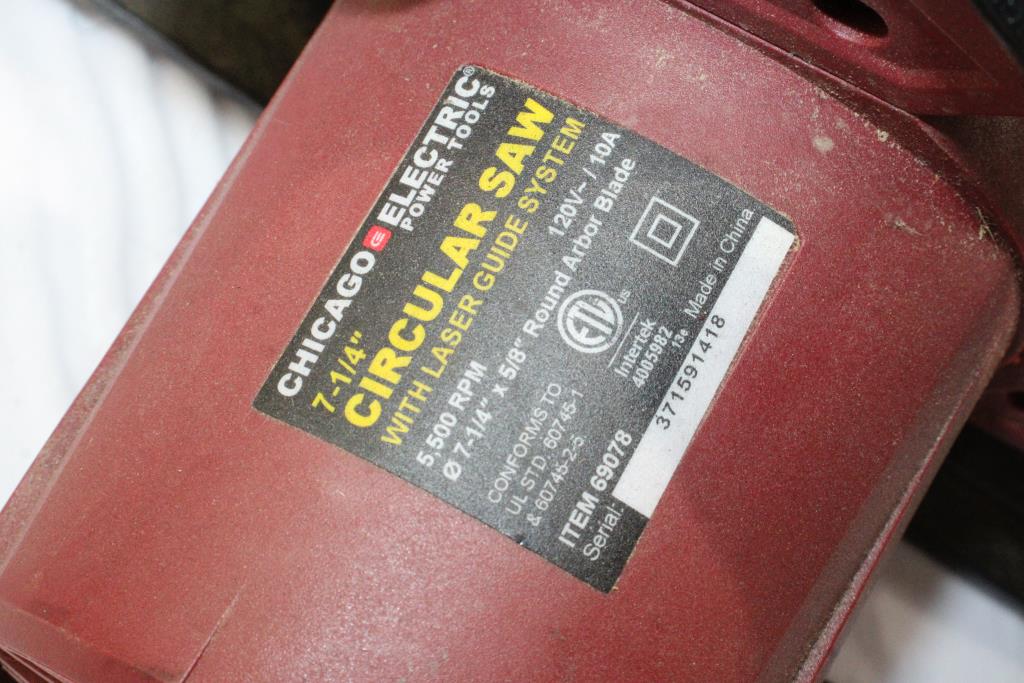 Chicago Electric Circular Saw. Laser guide does not function. Fair condition, appears to have visible wear, has scratches and scrapes, is dirty. Parts/ pieces /accessories may be missing or are not included. TESTED FOR POWER ONLY!!!! Saw works but Laser guid does not function. Condition: Fair