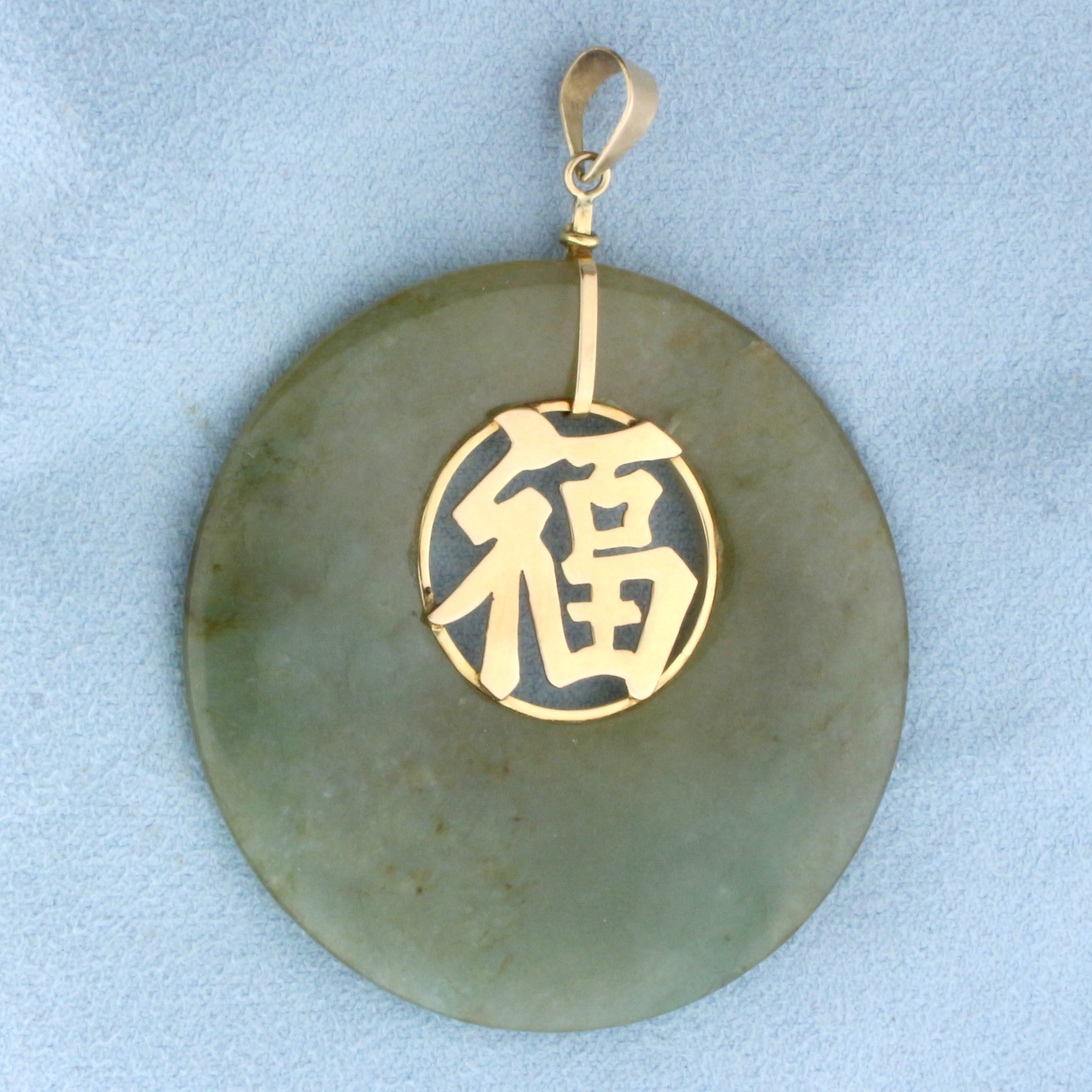 In 14k yellow gold. Chinese Symbol for Good Fortune in high quality Jade gemstone. 2 1/2 inches long with bale. 20.2g.