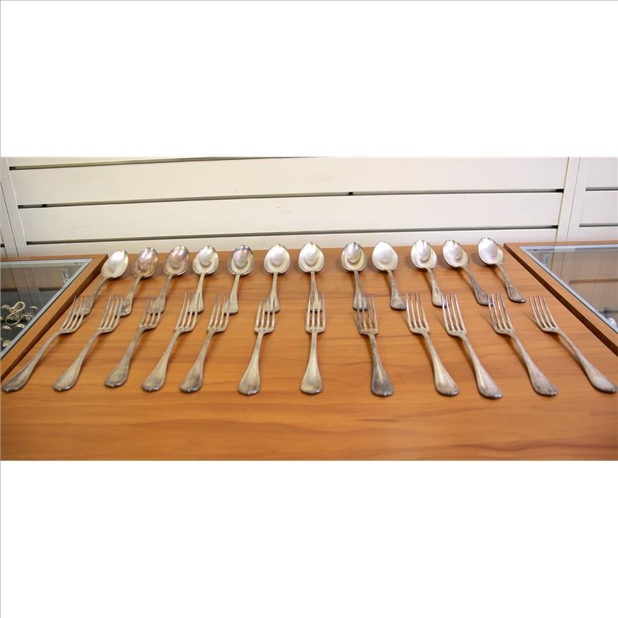 Silverplate, old marks early 20th century. Twenty four pieces total. Twelve forks 8.5 inches. Twelve European Place/oval soup spoons 8.5 inches. This is a rare set of larger pieces with a faint hand engraved monogram on the back side. 1874g.