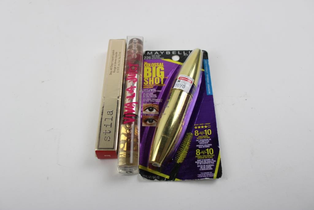 - Type: Clinique Moisturizing Gel, Stila Liquid Lipstick, Viva La Juicy Gold Couture Roll-On Eau De Parfum, Maybelline Colossal Big Shot Mascara