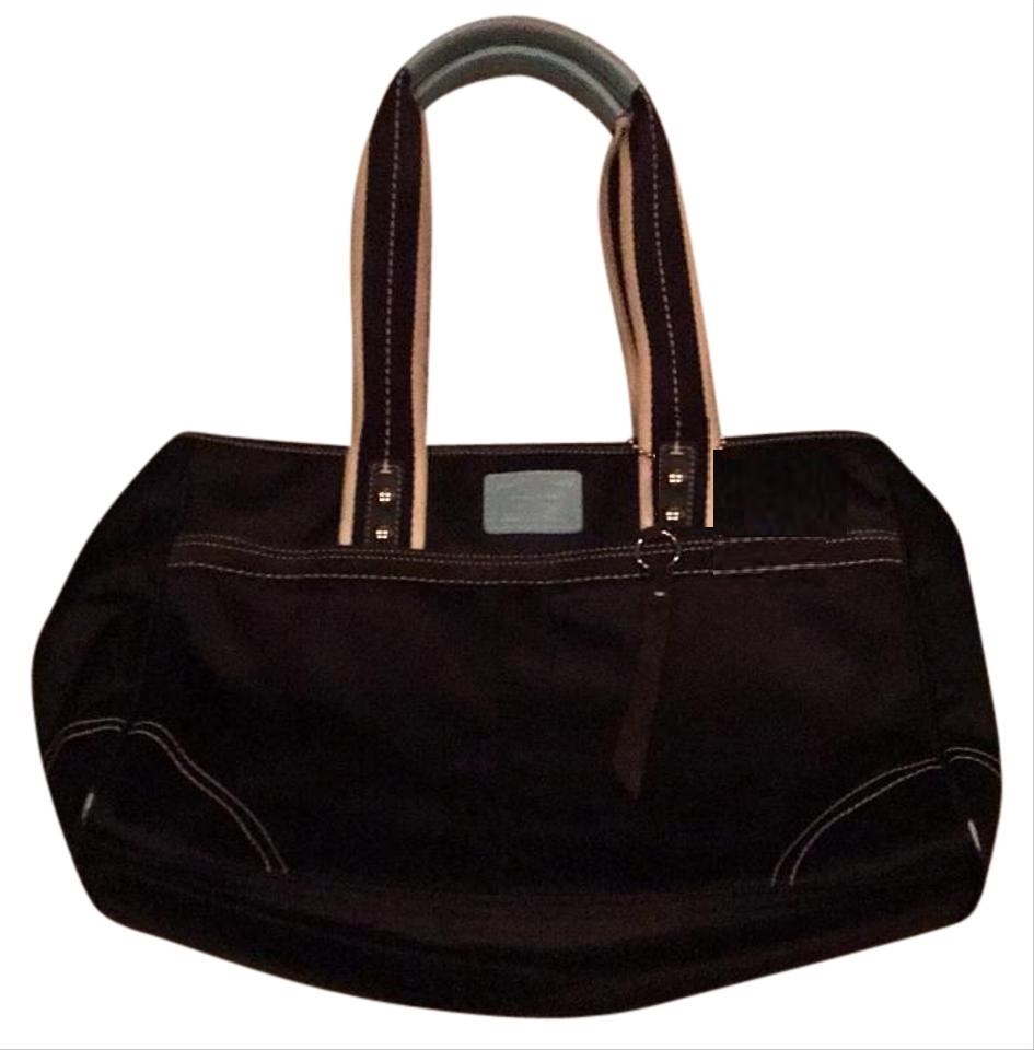 Black nylon coach bag with zipper closure and front zipper pocket.