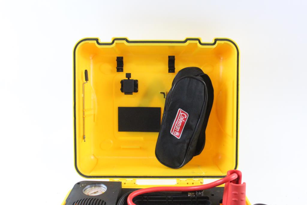 - Model: Unknown air compressor with jumper cables, in yellow case