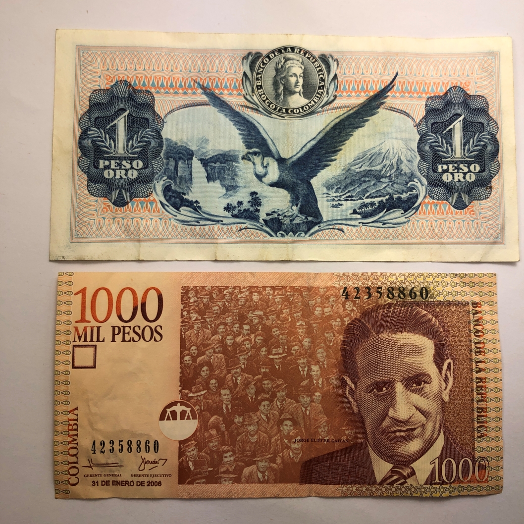 Colombia 1000 Pesos and 1 Peso Banknotes in Protective Sleeve