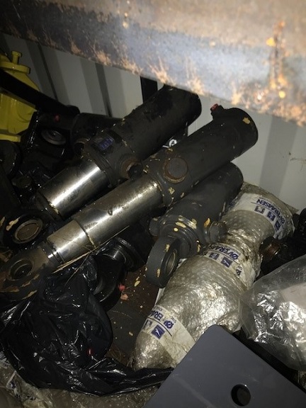 Conex Container is aprox. 20'L x 8'W x 8.5T. Items included (not all pictured): Overaasen trailer; Overaasen trailer stand; bolt/pin for plow stops; brass bushing; broom jack adjuster motor; brass bushing; complete lift assy. (rebuilt); hydraulic power angle rams; hydraulic cooler 12097; Mercedes exhaust; brake drums; radiator cooler package; broom lift cylinder; rear air filter; lower h linkage; Hosta subframe; stop leg; pendulum frame; bearing socket; plow frame plate (plow side); bolt/pin; frame back plate/to truck; bolt, pin/ # 1018080; upper frame are /#151850; lower frame are /#1497600; pendulum 1523500; Ford tail gates; Ford bumpers; Hetra portable vehicle lifts; Wacker asphalt roller; small asphalt roller.