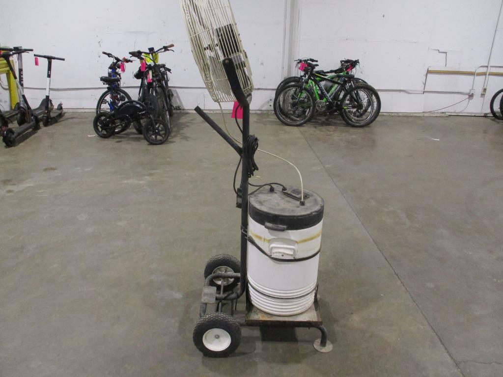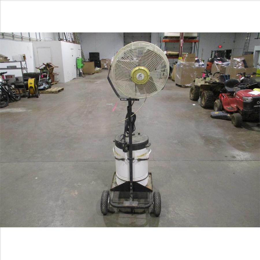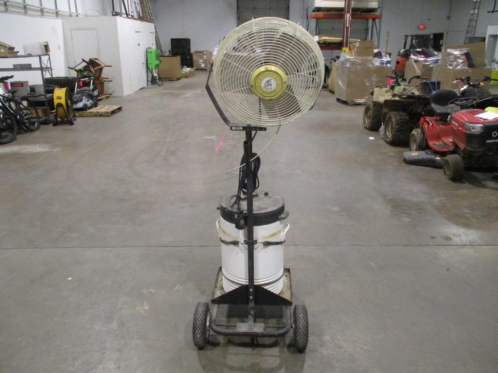 - dual on and off switch, plug in circuit breaker, reset and test on plug end, dual hoses coming out of water jug, 4 wheels for easy mobility, 36" fan blades, fan holder bent