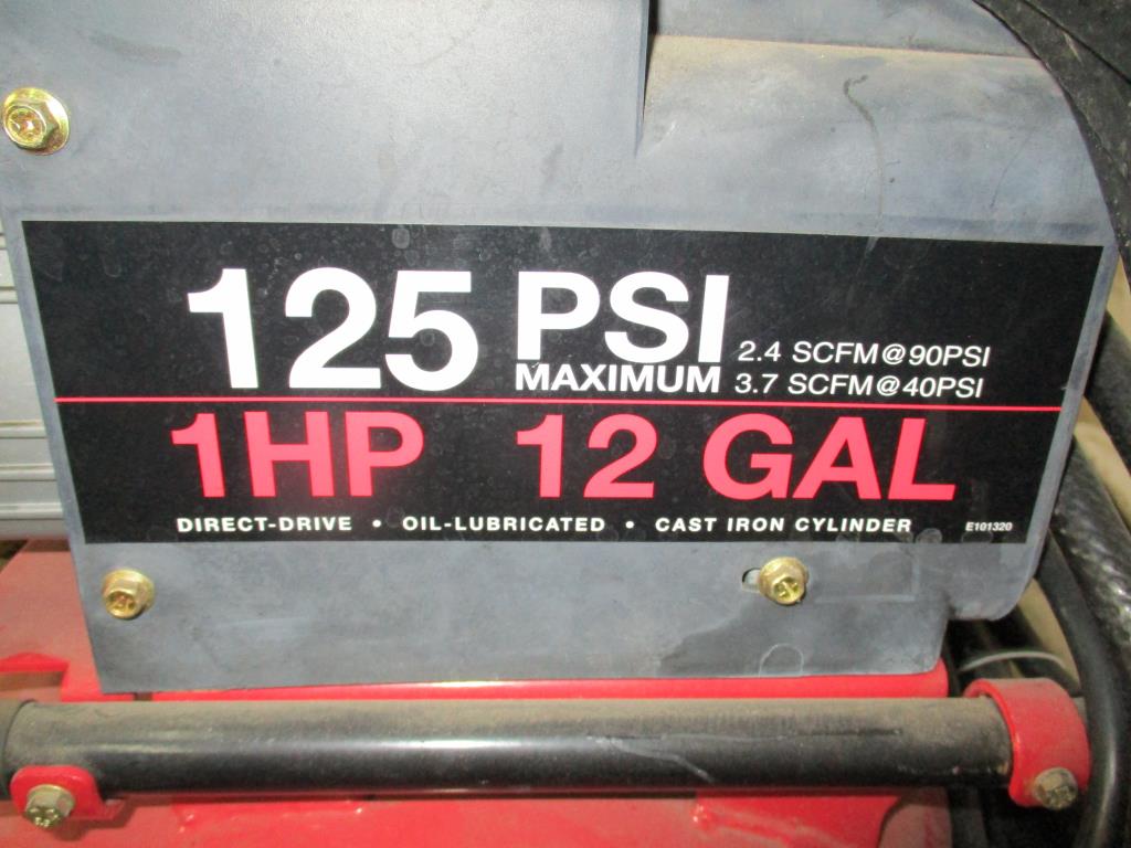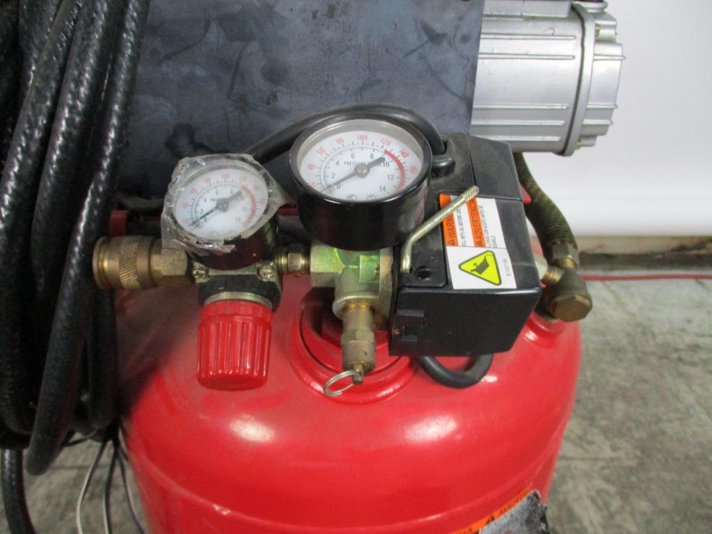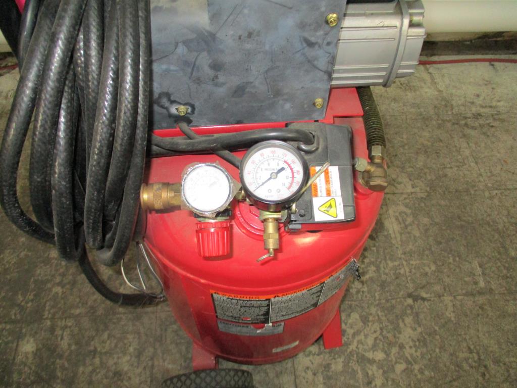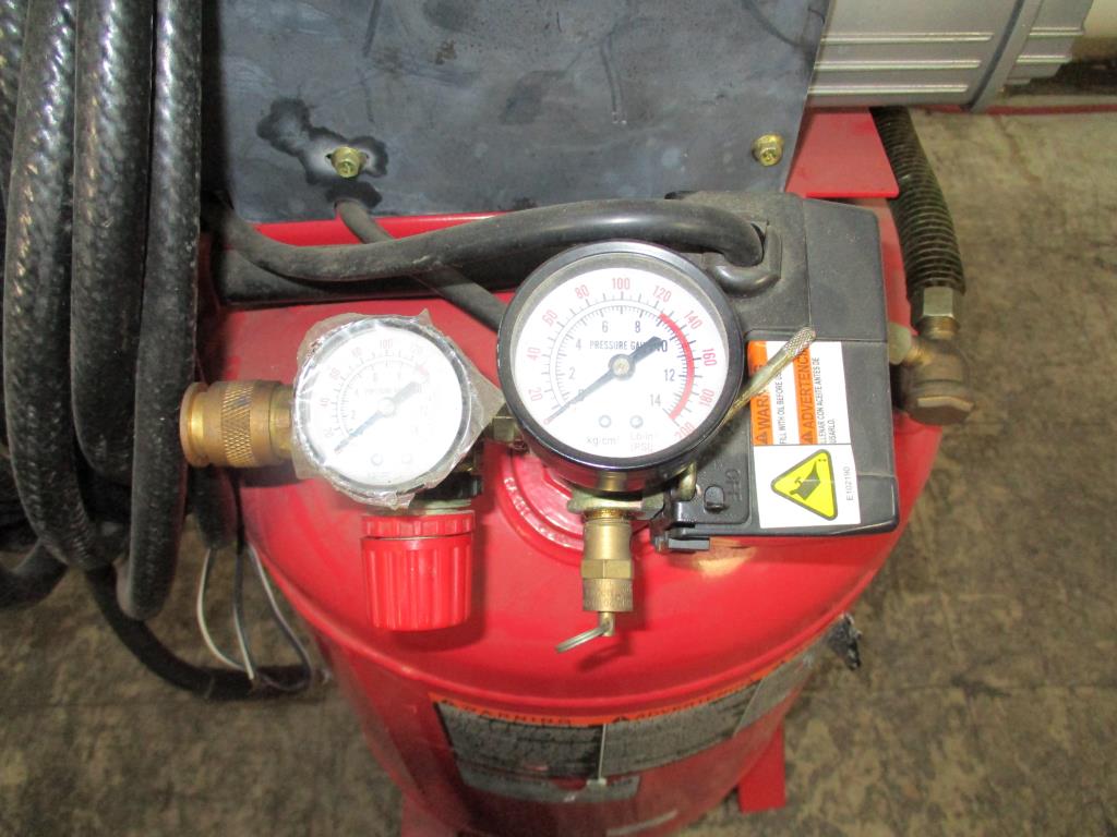 - handle with dual wheels, 12 gal tank, dual gauges, hose attach, 125 psi max, air adjustable knob