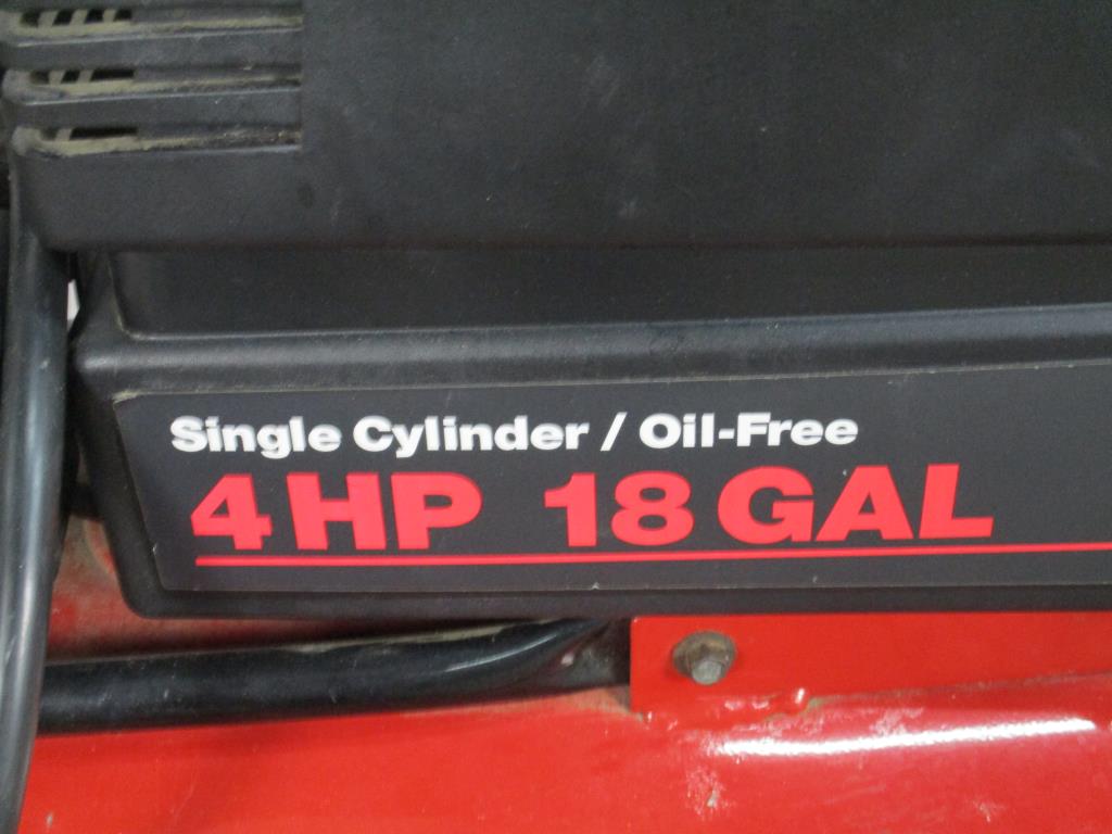 - Accessories: 4 Hp 18 gallon, wheels, hose, single cylinder, 125 max psi