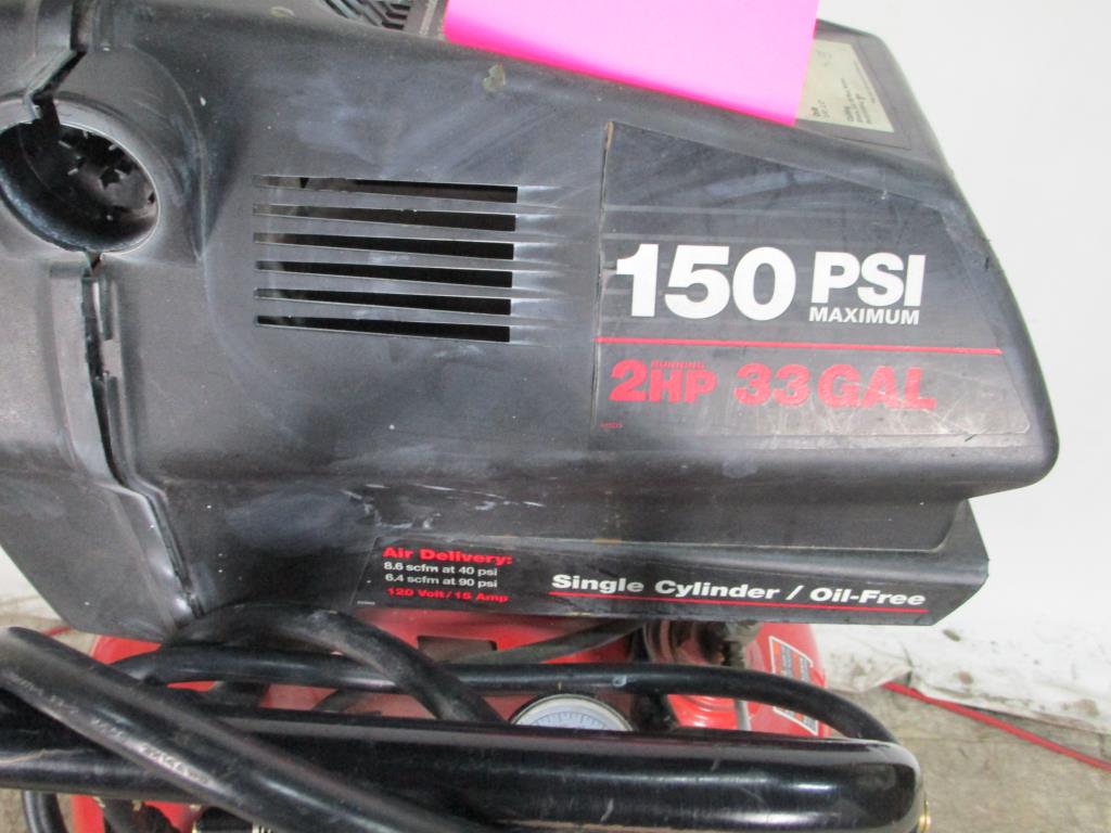 - Accessories: Electric, 33 gal tank, start switch, dual psi guages, 2.hp.