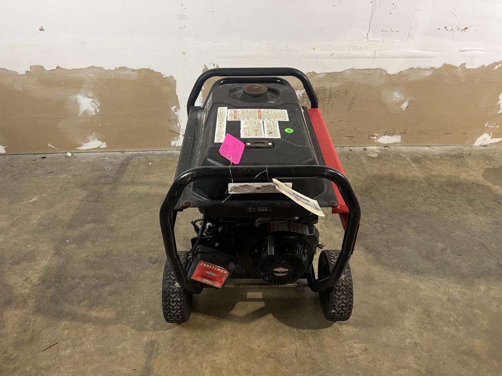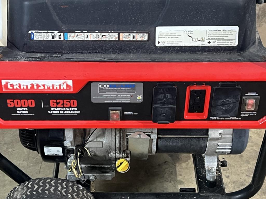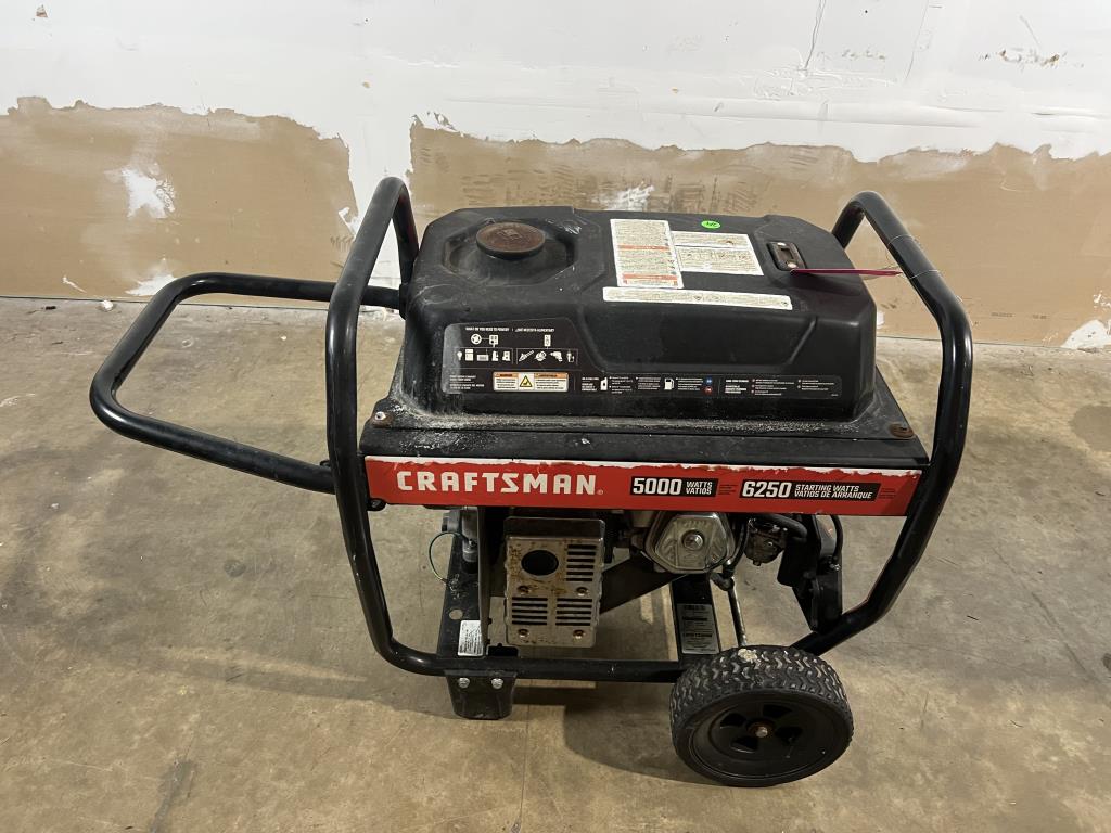 - Item info: gas powered, pull cord start, 5000 watts running, 6250 starting, on/off switch, 2 dual sets of wall plugs, main breaker switch, dual wheels, easy move handle, fuel guage, craftsman motor 306cc