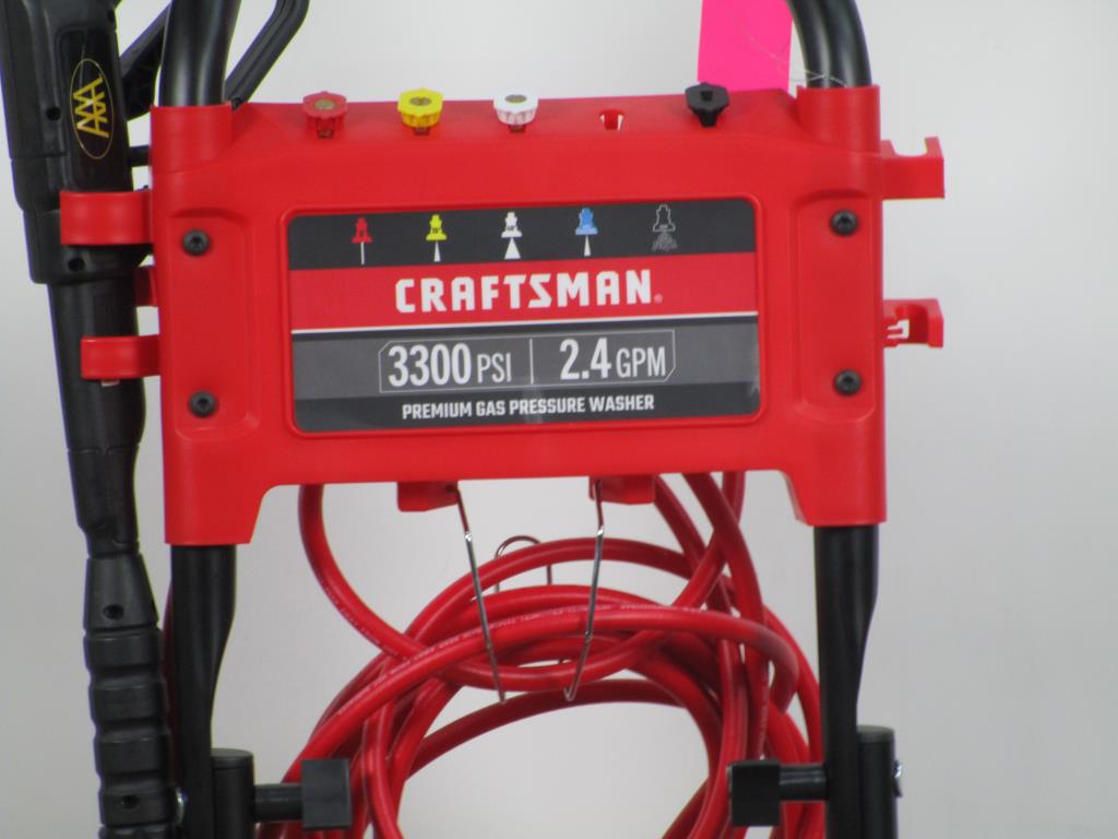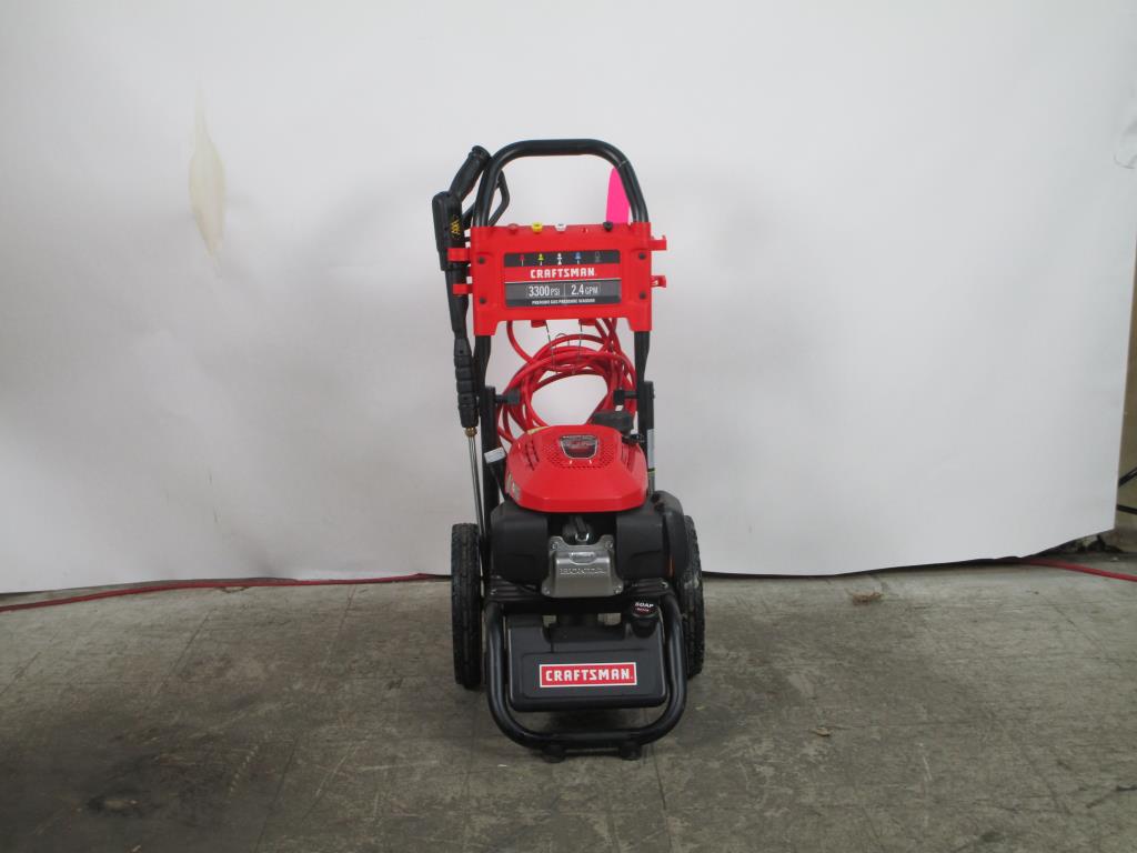 - gas powered, pull cord start, honda GVC 200 engine, 3300 PSI, 2.4GPM, gun with 10 foot hose, 4 nozzle tips, hnadle with wheels, soap tank