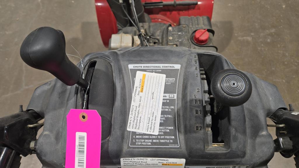 - Item info: gas powered, self propelled, 9.0 28" clearing, 6 forward gears, 2 reverse, left handle auger, right handle drive, knob to change shute direction and angle