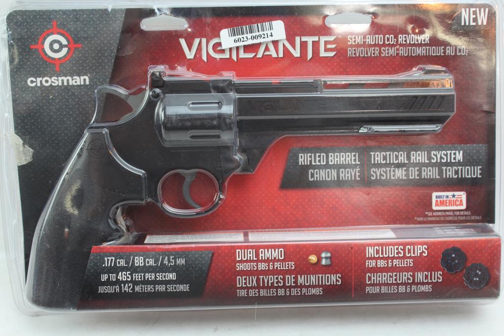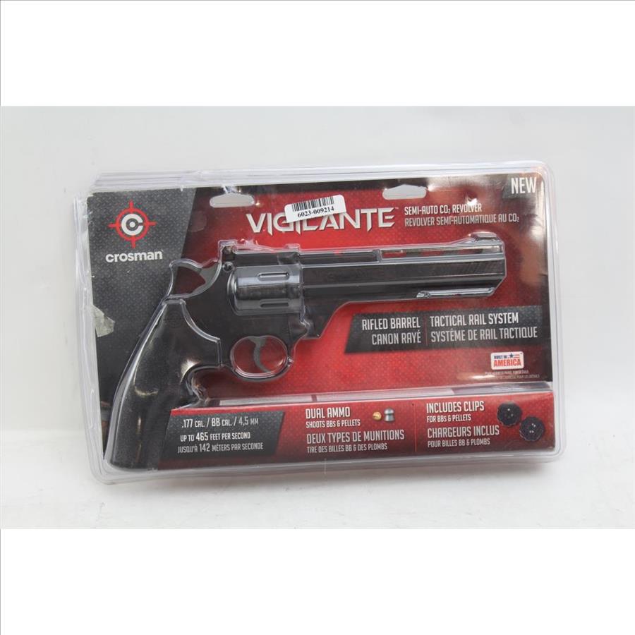 Get a great deal with this online auction for an air pistol presented by Property Room on behalf of a law enforcement or public agency client. - Model: Crosman Vigilante CO2 Air Pistol Revolver Steel Black CCP8B2 - 028478141780