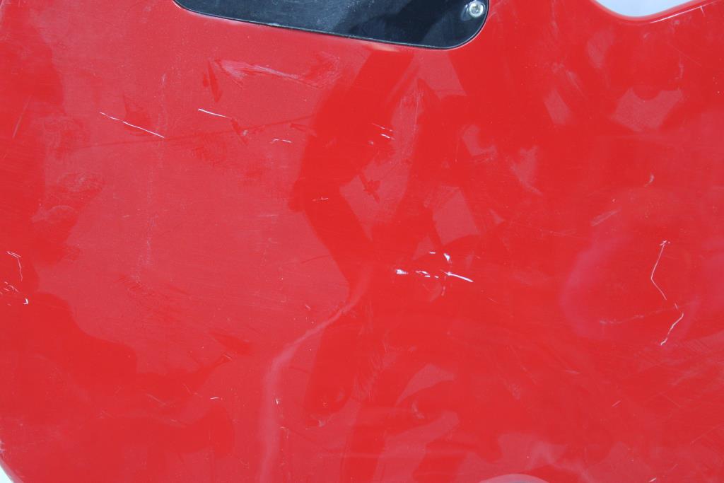 - Cosmetic Condition: Poor condition, appears to have visible wear, has scratches and scrapes, is dirty. Parts/ pieces /accessories may be missing or are not included. One inch size chip in the wood on right side of base of the guitar.