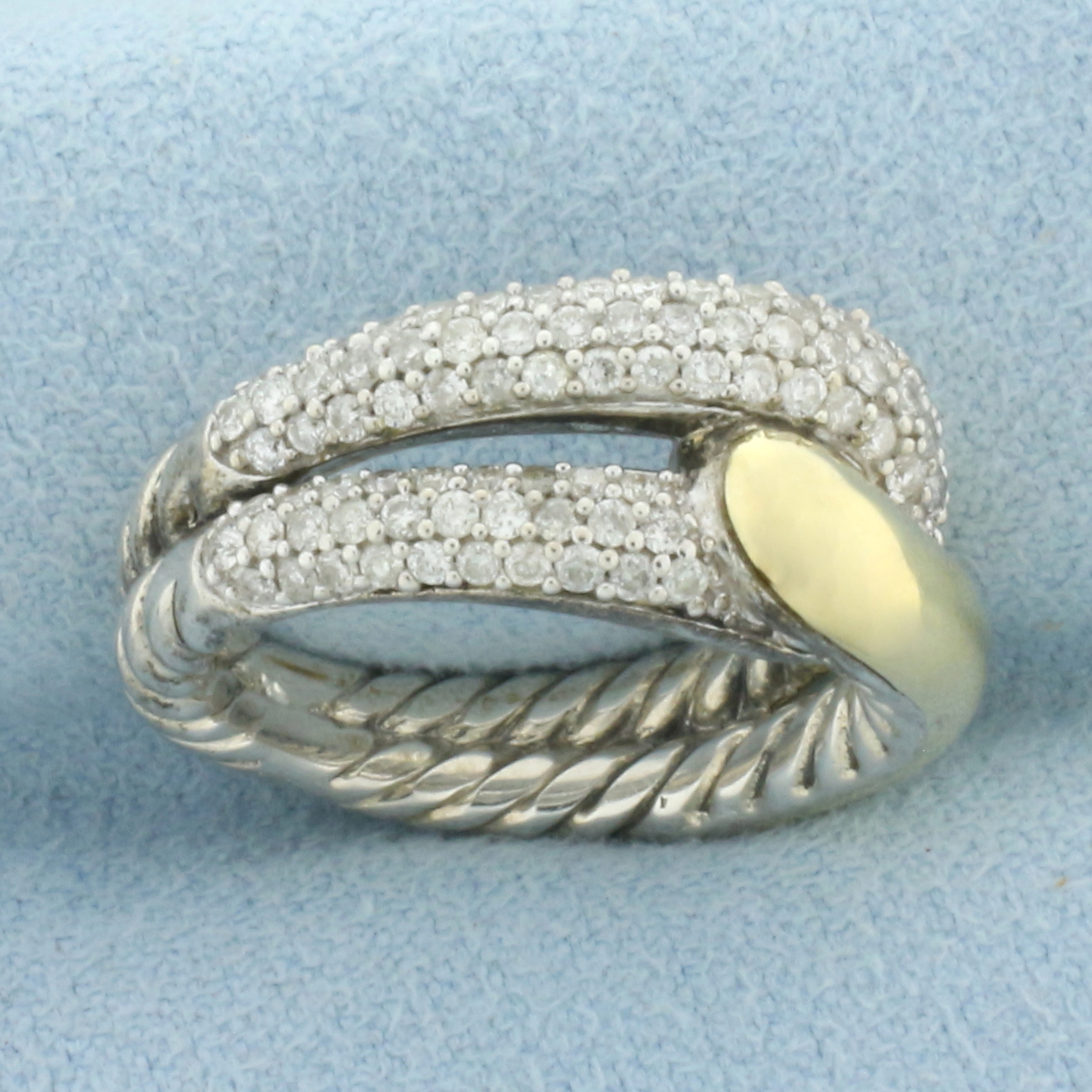 In 18k yellow gold and .925 sterling silver. Contains seventy-eight high quality 1/2pt diamonds. 9.2mm wide at widest point. Size: 5. 9.2g.