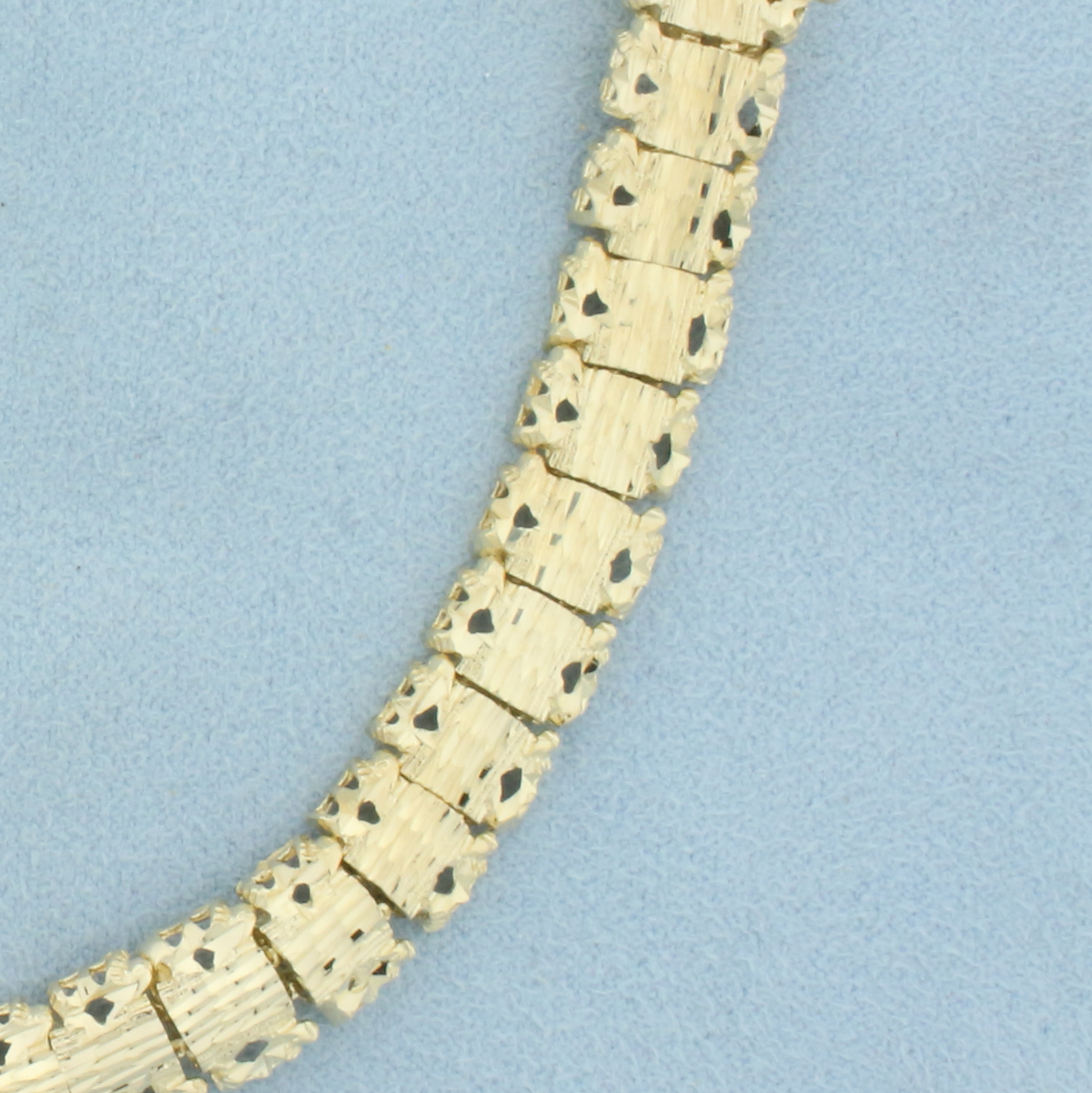 In 14k yellow gold. 7.25 inches long, 3/8inch wide. Concealed slide clasp with 2 safety latches. 17.7g.