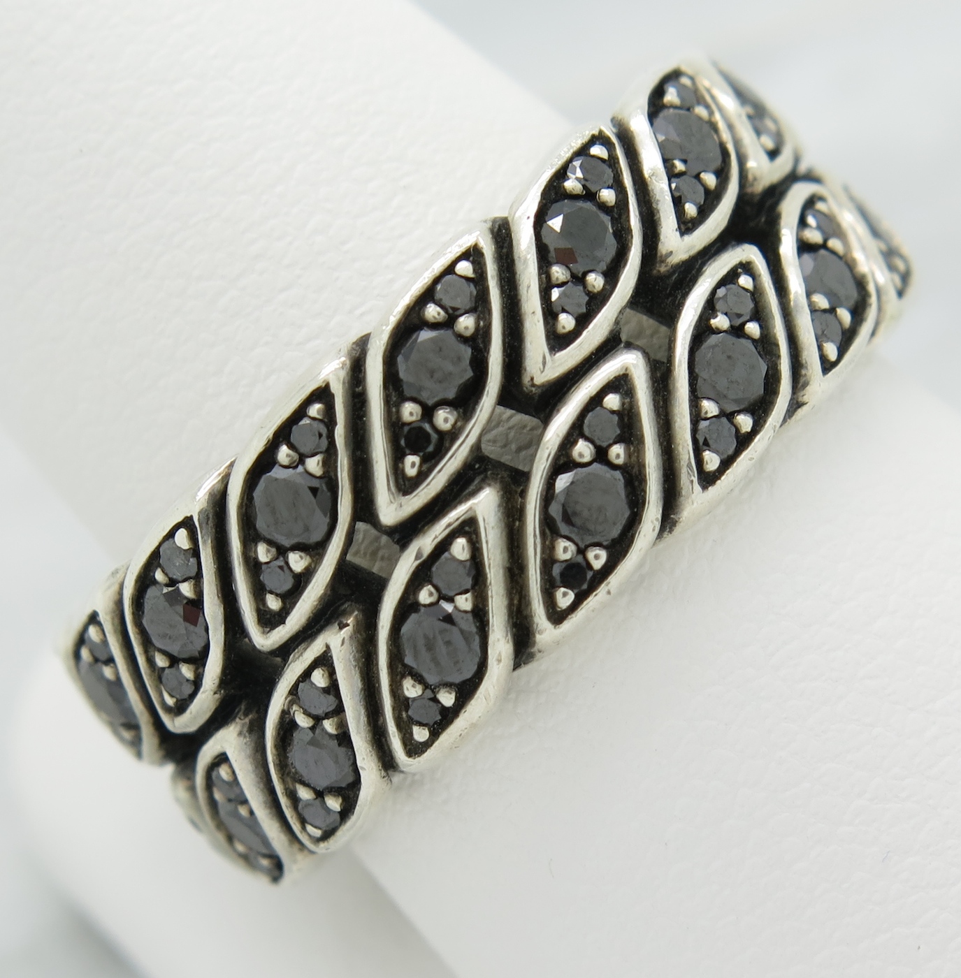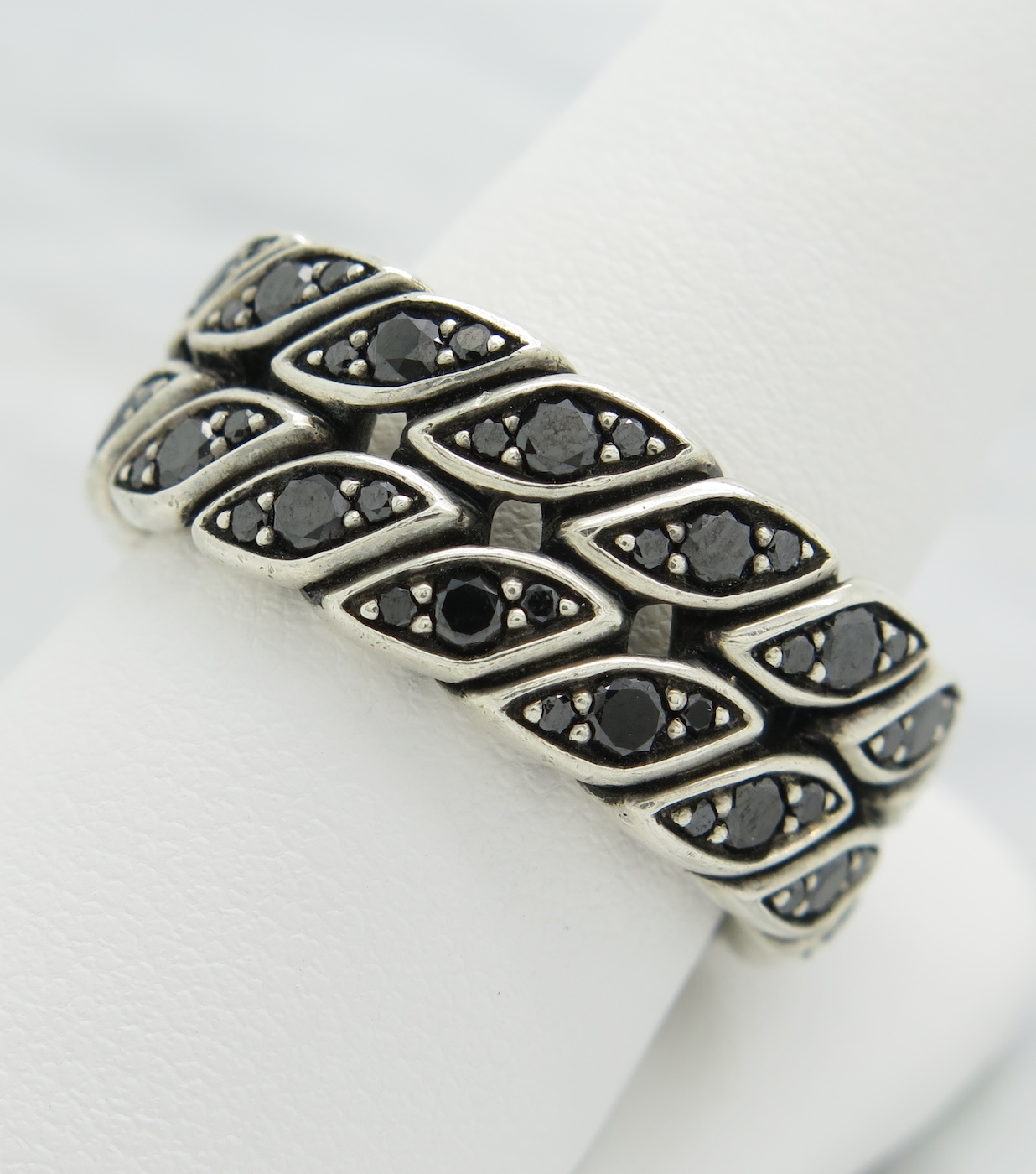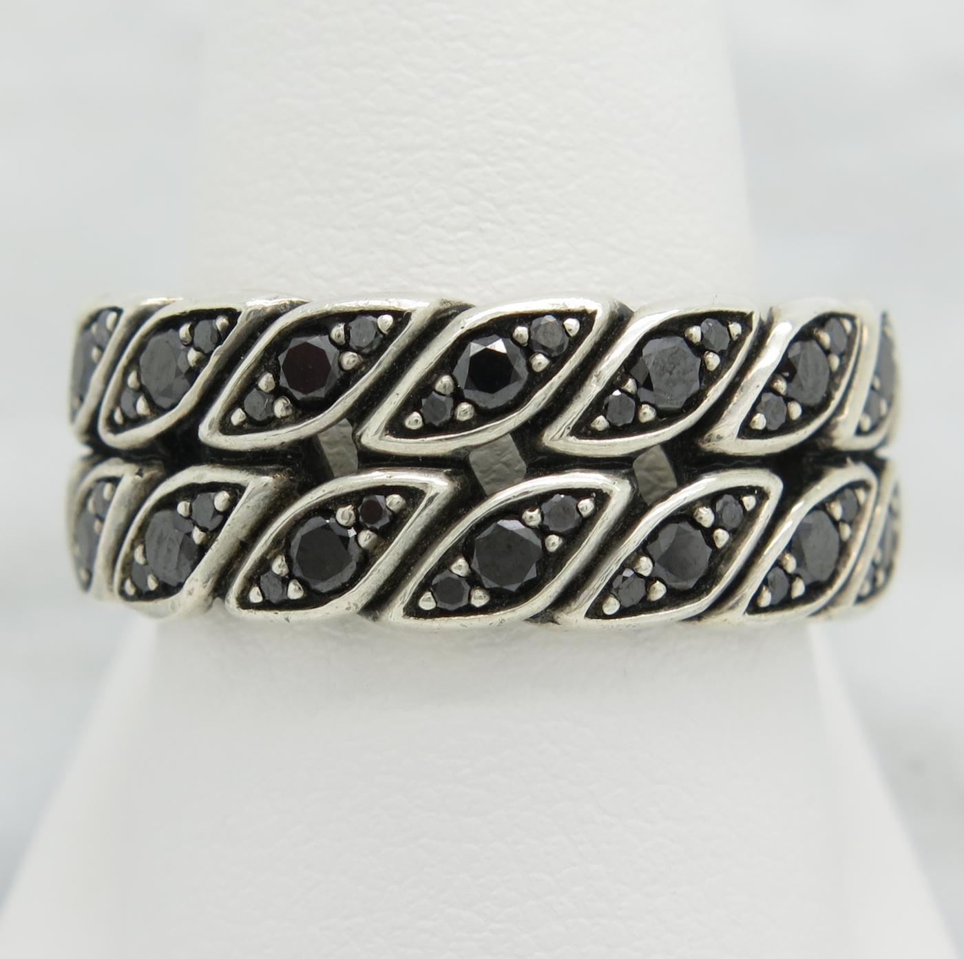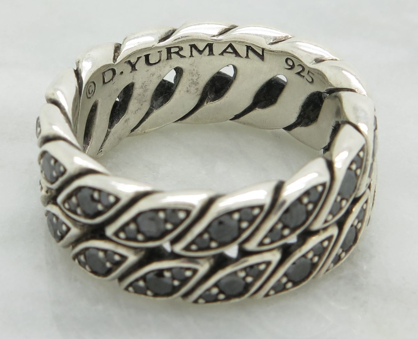 This gorgeous diamond eternity band by David Yurman features 90 Round Brilliant Cut Black Diamonds. The total diamond weight is approximately 1.20CTW. The .925 sterling silver ring is size 10 and weighs 13.7 grams.