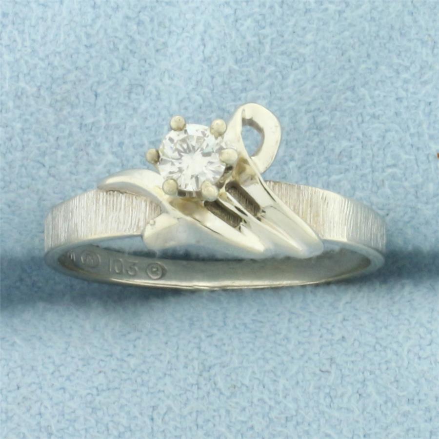 In 14k white gold. Contains one high quality 1/5ct diamond, H color/I clarity, eye clean, great cut for lots of sparkle. Unique etched finish on shoulders of ring for added brilliance. Size: 6. 2.2g.