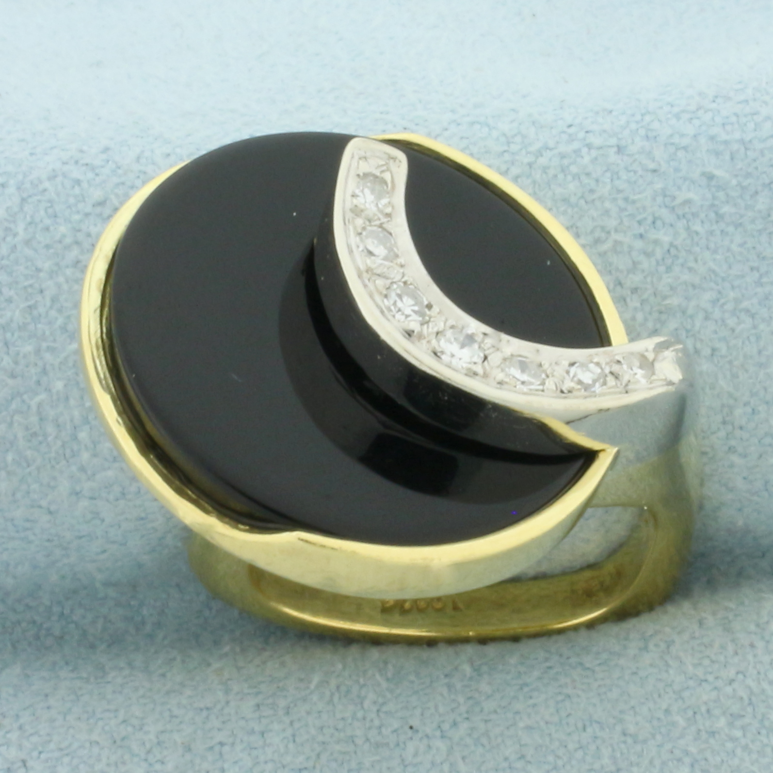 In 18k Yellow and White Gold. Contains one 20mm circular Onyx plaque. Also contains seven high quality diamonds, 1/4ct TW, VS clarity/G color. 21mm wide at top. Euro shank. Size 5.5. 15.2g.