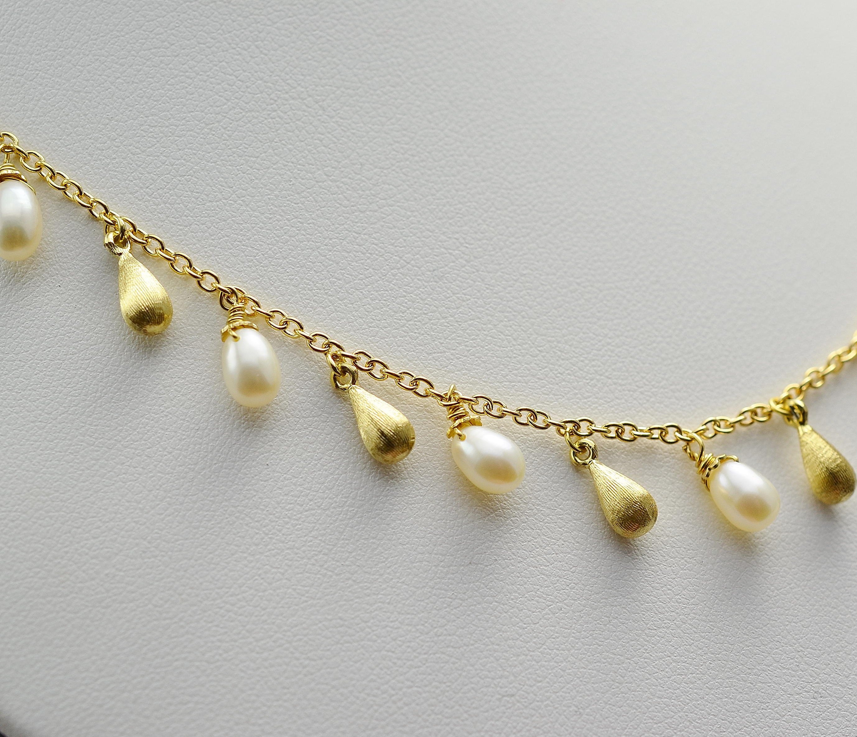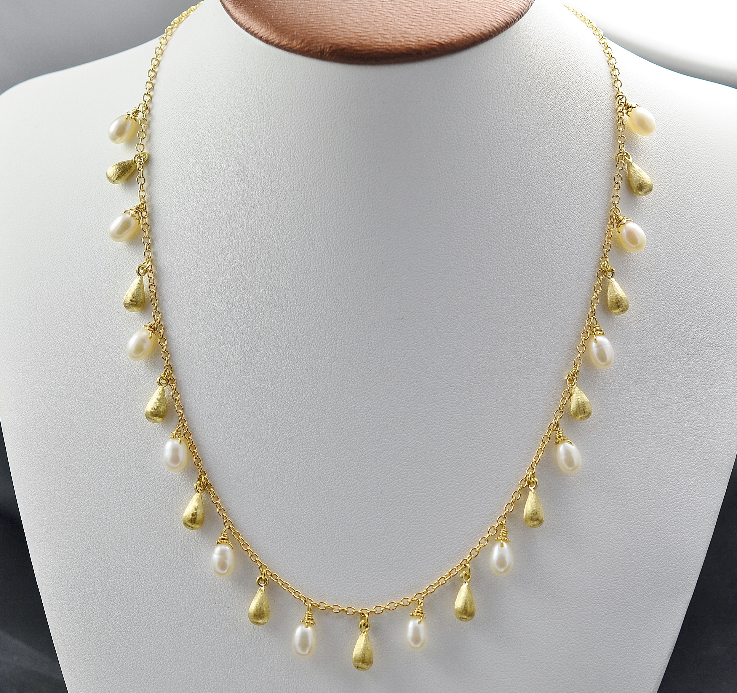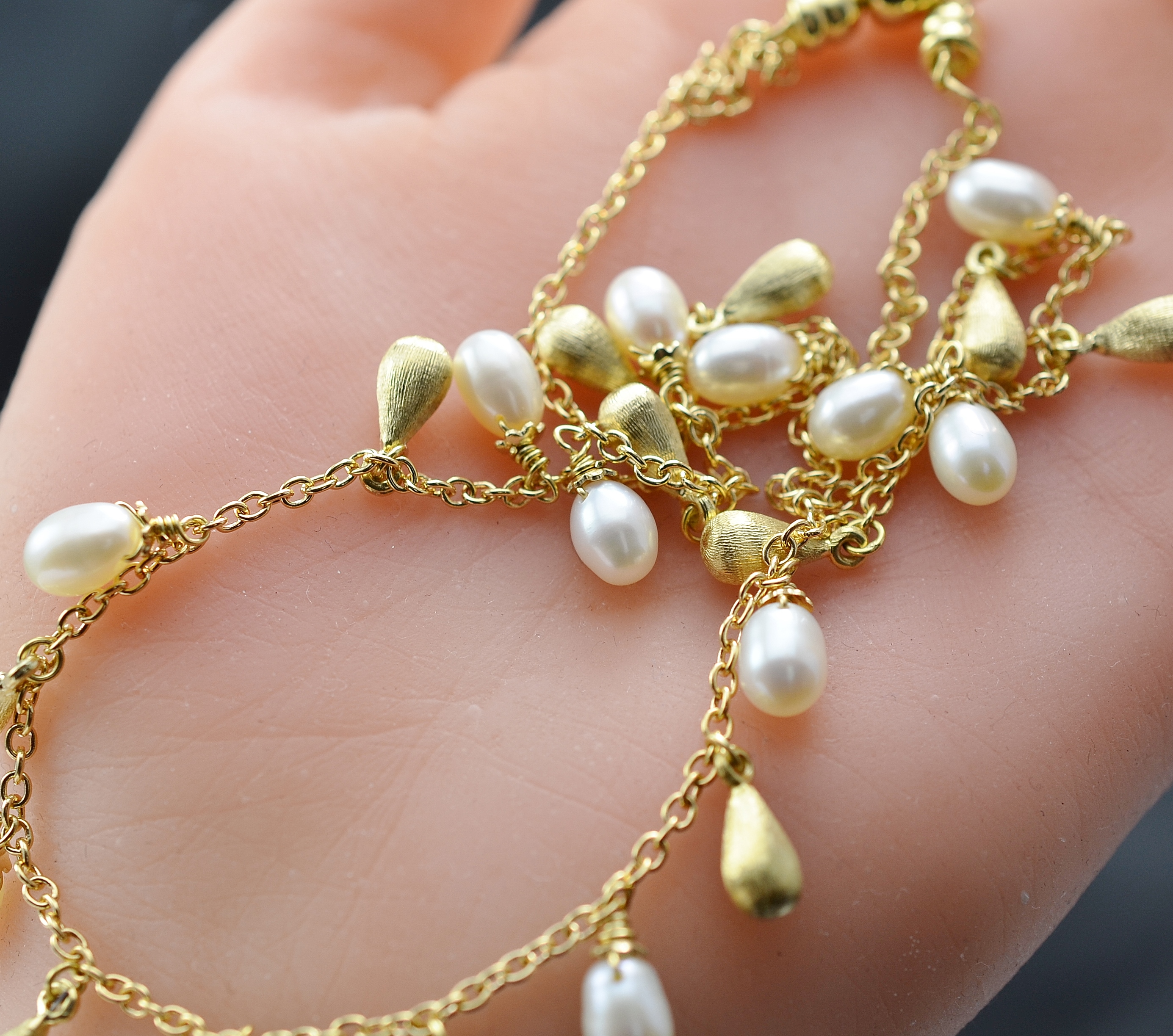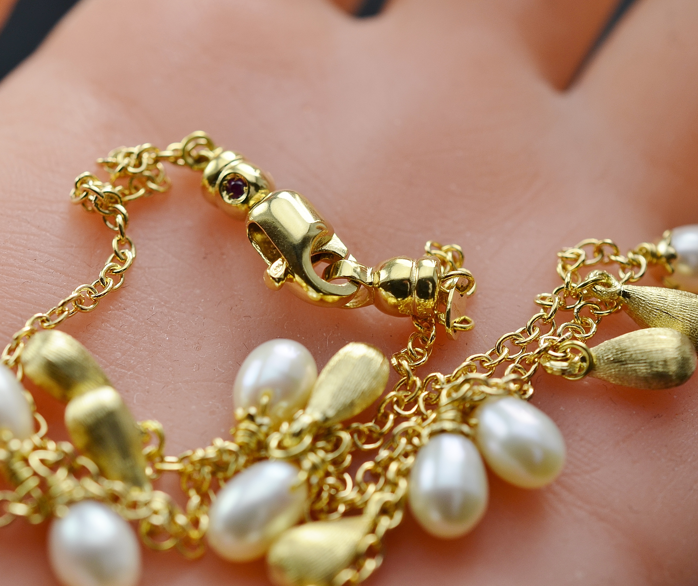 Very pretty Roberto Coin 18K gold and pearl necklace. This piece is fun to wear with plenty of style and quality. Solid 18K gold with the signature ruby on the clasp. Made in Italy. Look for the matching bracelet here on Property Room.