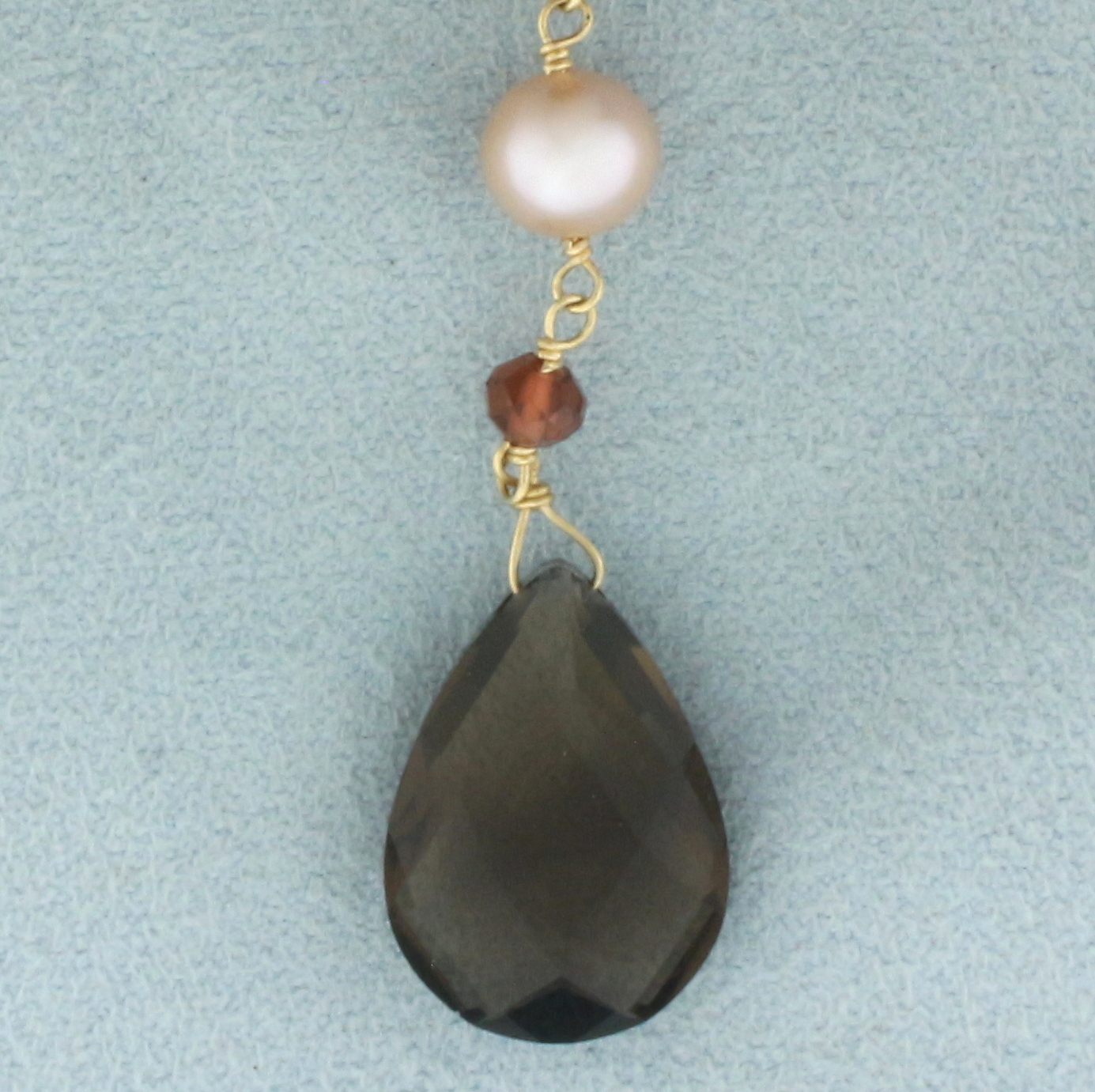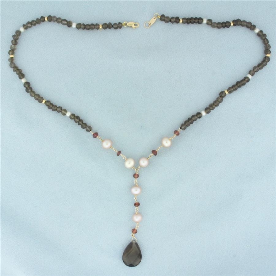 In 14k yellow gold. Contains one high quality 18mm Smoky Topaz gemstone with intense color and excellent clarity. Also contains six high quality 7mm pink cultured pearls with high luster; seven high quality 4mm garnet faceted beads; eight high quality 3.5mm cultured baroque pearls; eight high quality rondelle gold beads; and ninety high quality 4.5mm smoky topaz faceted beads. 17 inches long with 2.75 inches long center drop. Lobster clasp.
