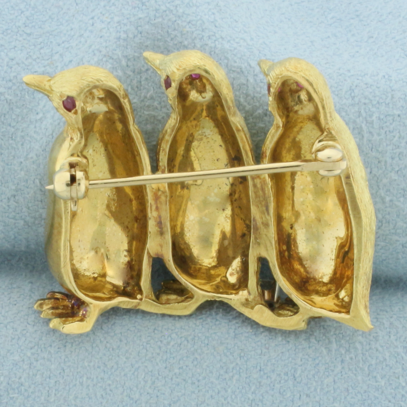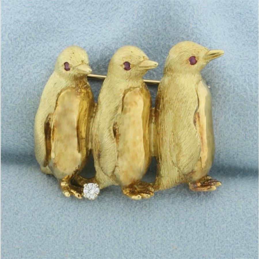 Diamond and Ruby Penguin Pin in 18k Yellow Gold