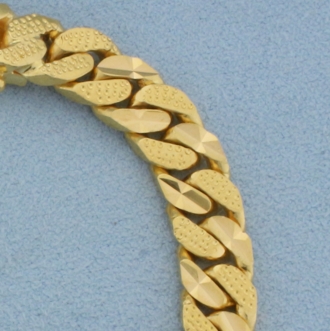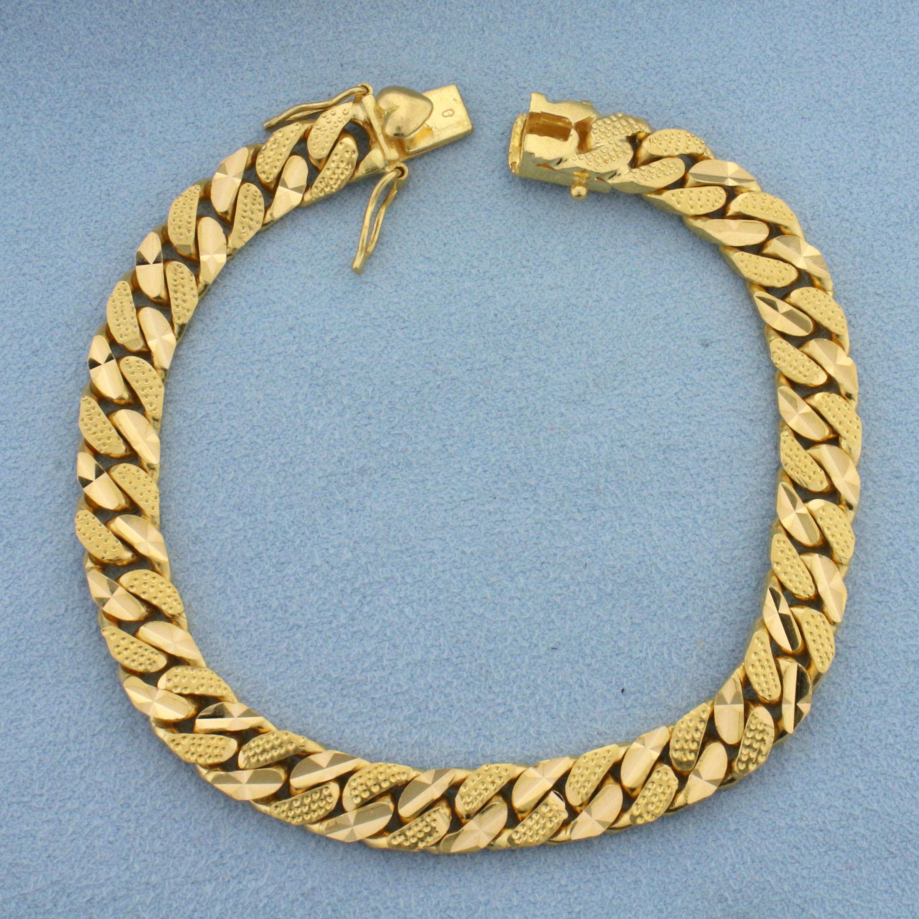 In 22k yellow gold. 8 inches long, 7.6mm wide. Double safety clasp. 45.9g.