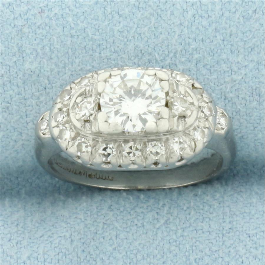 In Platinum. Contains one 2/3ct round brilliant diamonds, SI clarity/I color, great cut for lots of sparkle. Also contains 1/3ct TW of diamonds of similar high quality surrounding center diamond. 9mm wide at top Size 4. 5.6g.