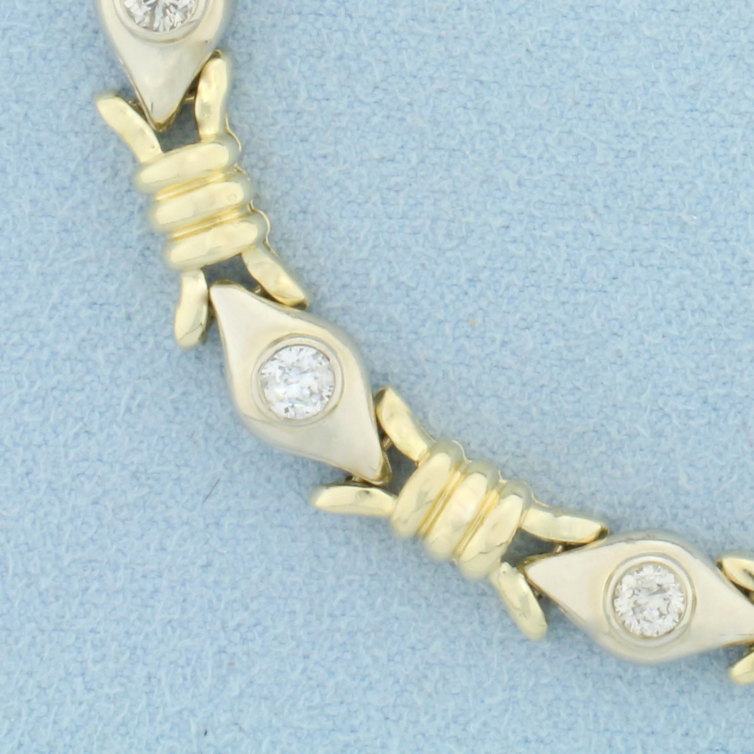 In 14k yellow and white gold. Contains nine high quality diamonds, 1 1/2ct TW, SI2 clarity/H color. 6 3/4 inches long, 6mm wide. Slide clasp with safety latch. 14.3g.
