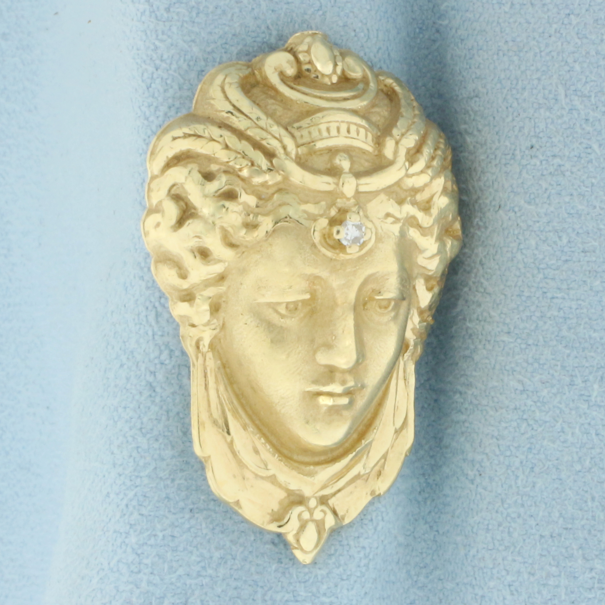 In 14k Yellow Gold. Contains one high quality .01ct diamond, SI clarity/H color. 1 3/8 inch long. 7/8 inch wide. 5.6g.