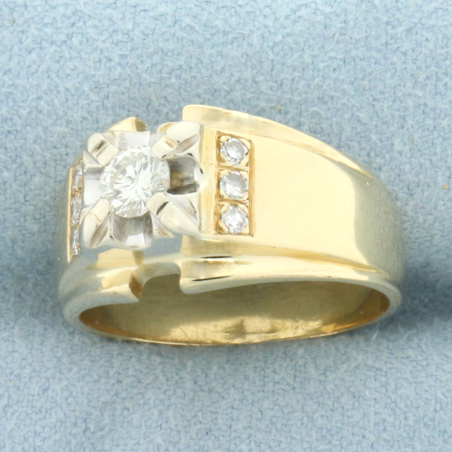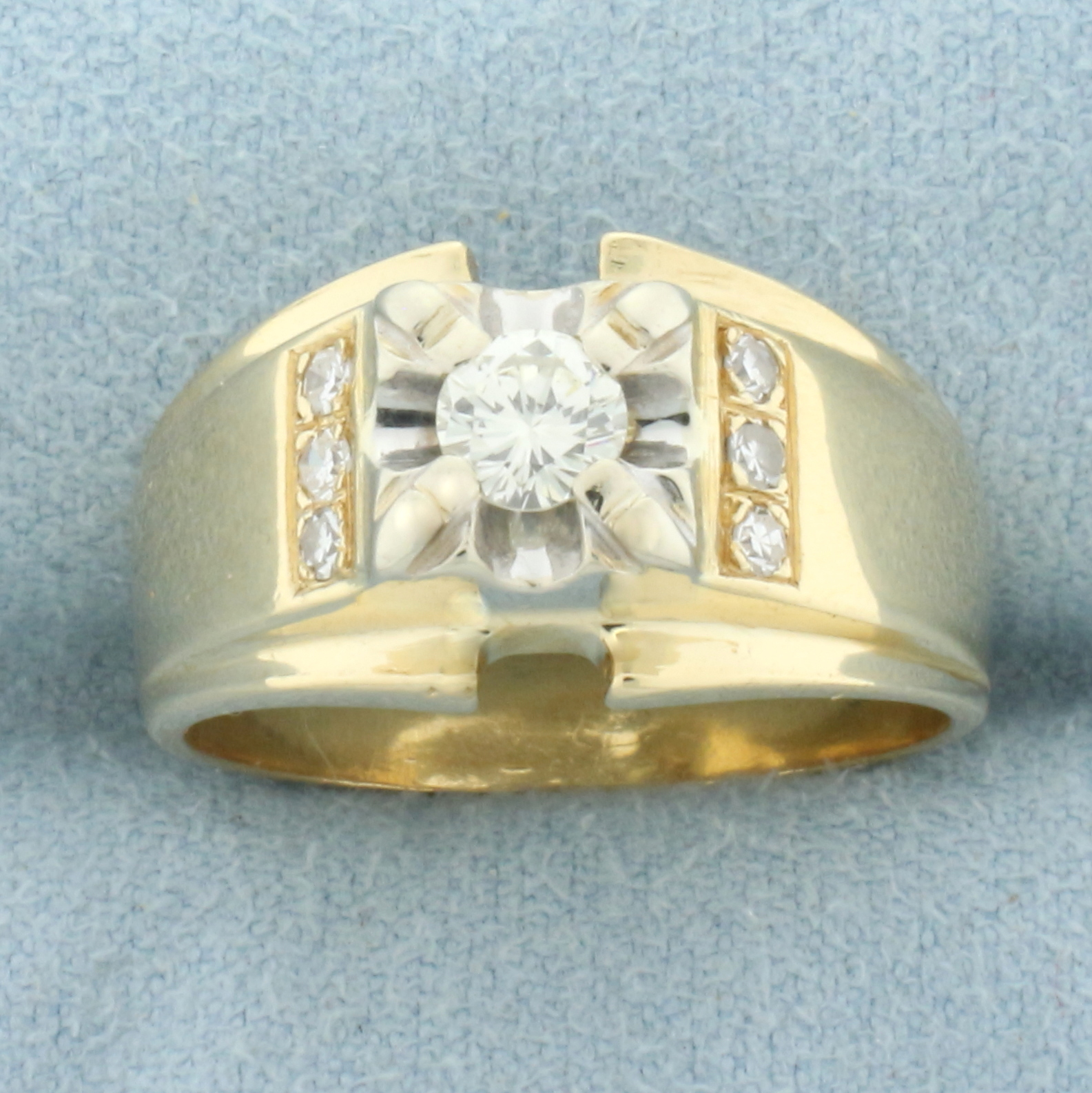 In 14k yellow and white gold. Contains one round brilliant 1/3ct high quality diamond, VS clarity/H color. Illusion set to make it appear to be an over 1ct diamond. Also contains six .02ct accent diamonds of similar high quality. Size 8.25. 8.2g.