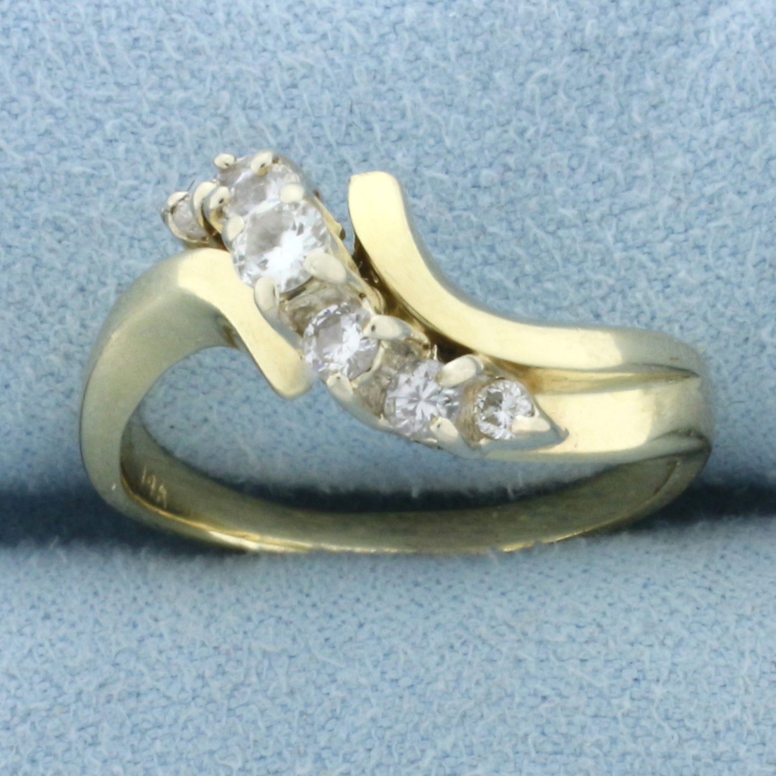 In 14k Yellow Gold. Contains one 1/8ct, four .07ct, and two .03ct high quality diamonds, VS clarity/H color . Size 8. 5.3g.