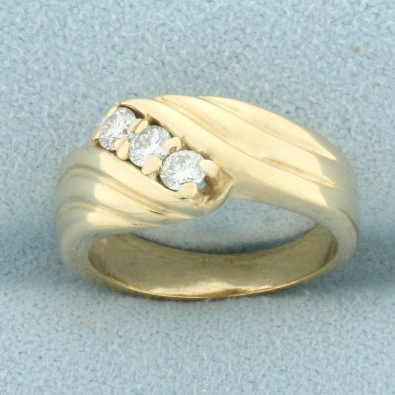 In 14k yellow gold. Contains three high quality diamonds, 1/4ct TW, VS clarity/H color. Size: 3.5. 4.7g.