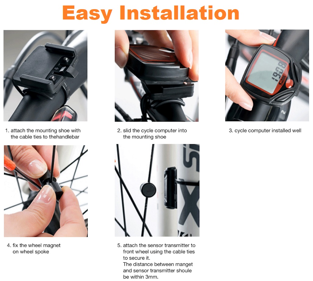 Cycle computer, Mounting shoe, Sensor cable, Magnet, Sensor transmitter, Cable ties, LR44 battery