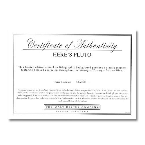A must-have for any collector, this piece is full of color and fun! “Here’s Pluto” is a limited edition sericel no longer in production! Includes certificate of authenticity! Measures Approx: 10” x 10” (background), 5” x 7” (actual image).