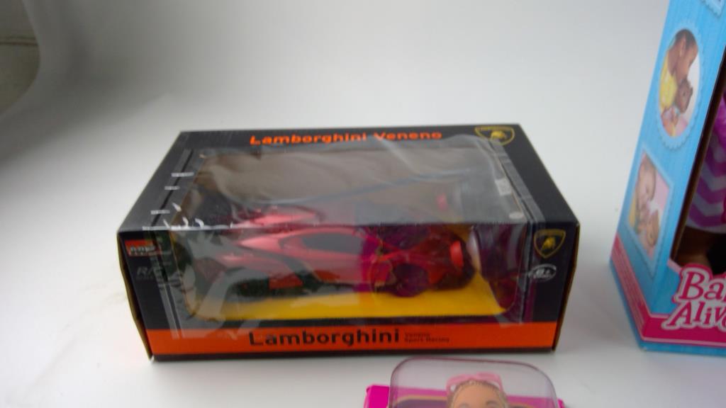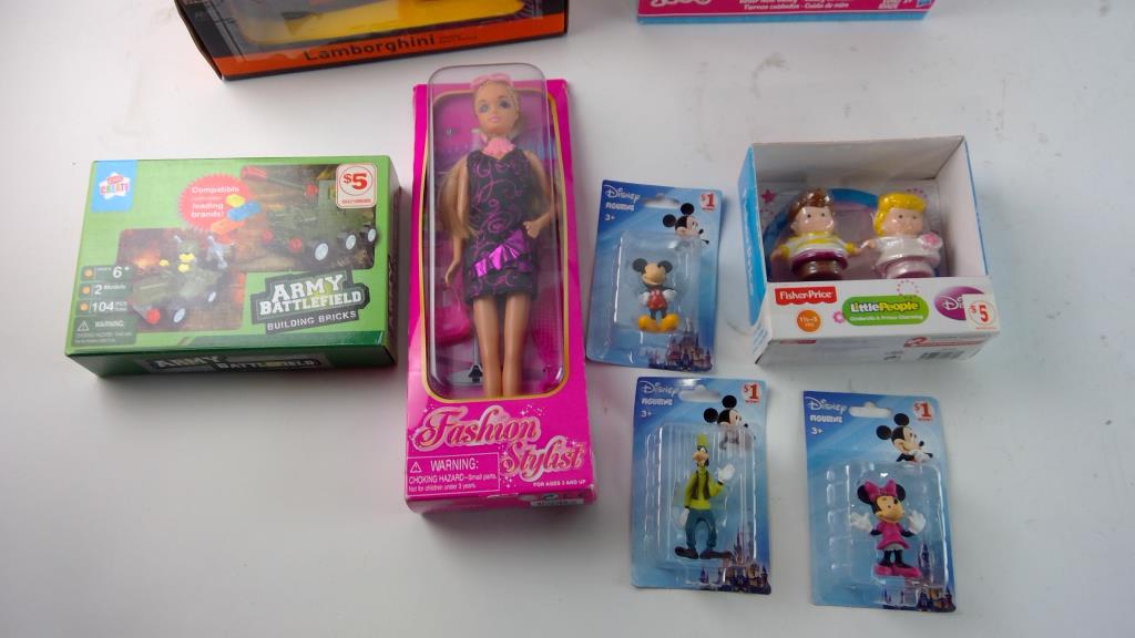 - Model: Goofy, Mickey, and minnie mouse figures, Army Battleifled building Bricks, Lamborghini Veneno RC Car, Cinderella and Prince charming figures, Fashion STylist doll, Baby Alive doll