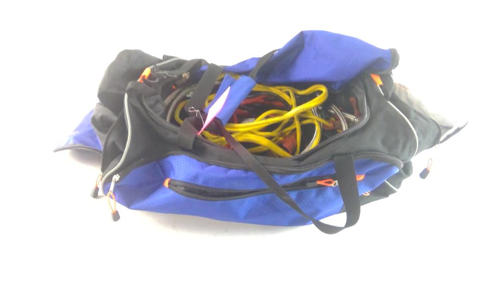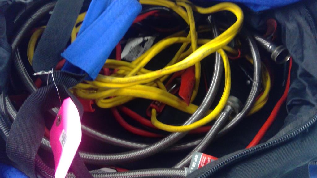 Duffle Bag With Jumper Cables And Washing Machine Hose