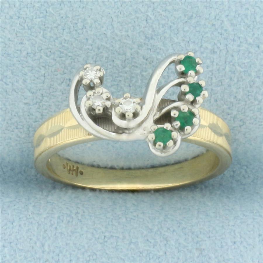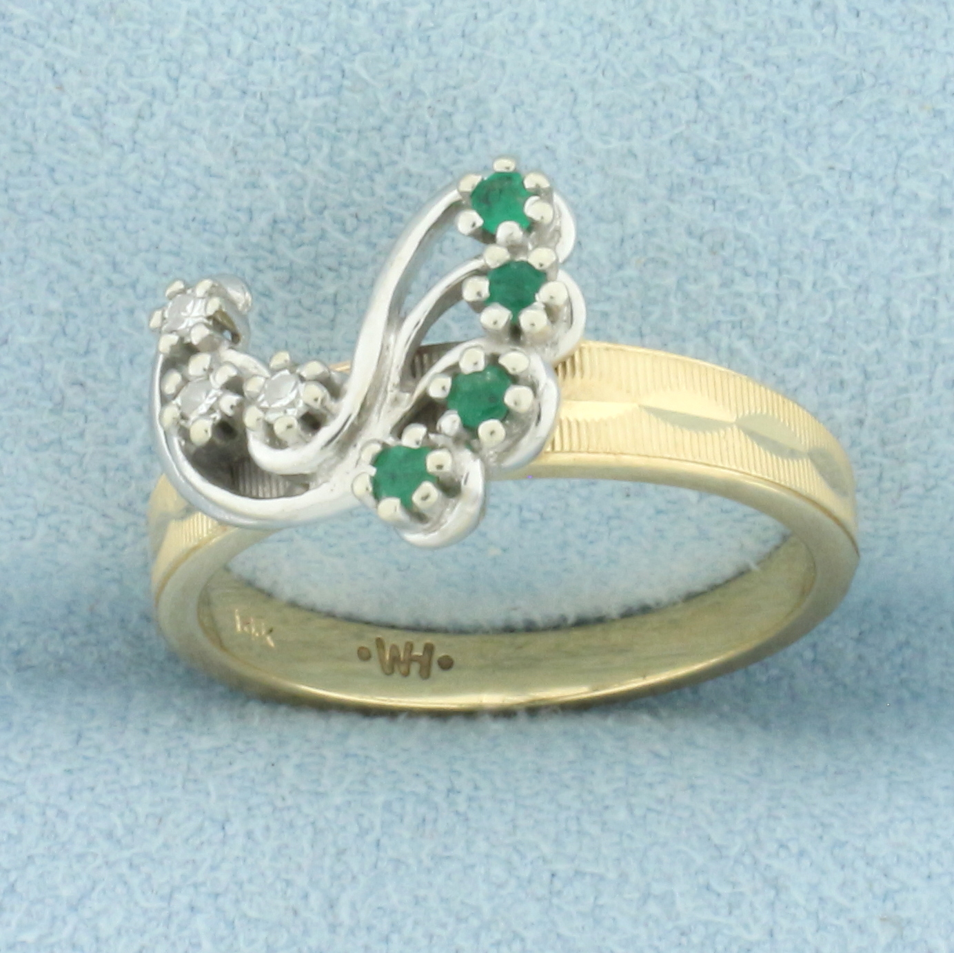 In 14k yellow and white gold. Contains four high quality natural Emerald gemstones, 1.75 to 2mm each, with intense color. Also contains three high quality .01ct diamonds, VS clarity/G color. Unique finish with diamond etching on shoulders of ring. Size: 6.5. 4.0g.
